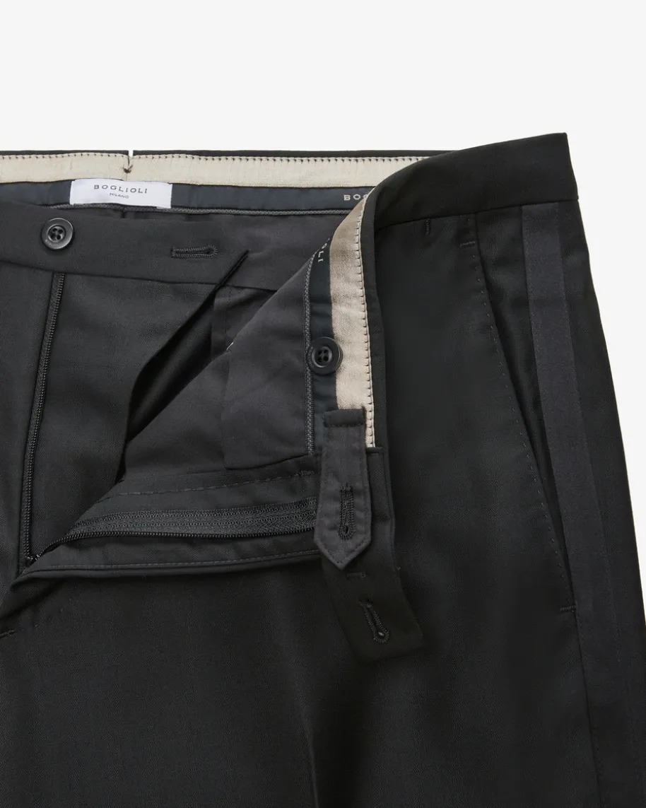 Smoking-Hose für Herren von Boglioli in Schwarz. Maskuline Eleganz – HochwertigeVerarbeitung in glatter Schurwoll-Qualität sowie klassisch-elegante Details wiedie tonalen Galon-Streifen machen die Hose zu einem stilsicheren Bestandteilgehobener Looks.