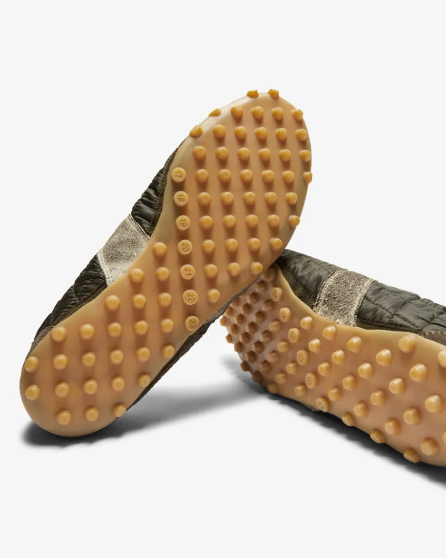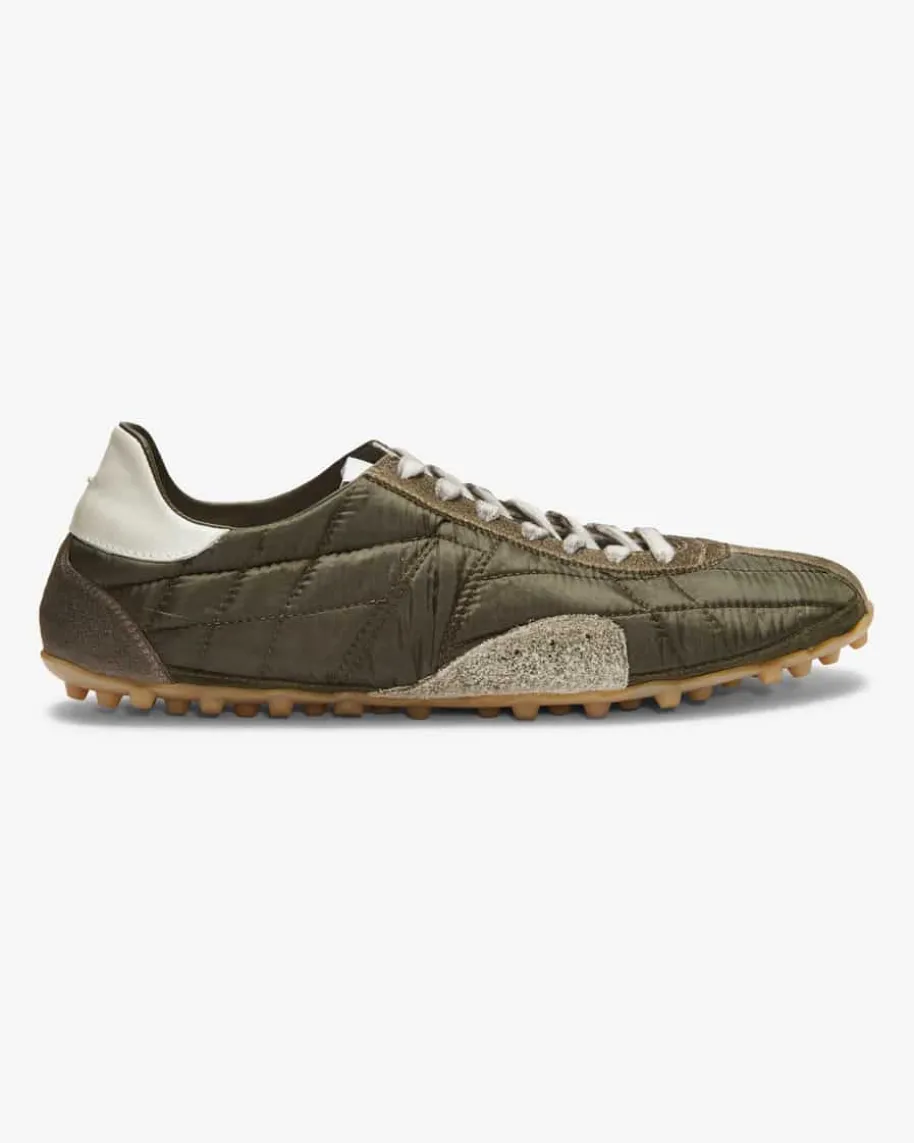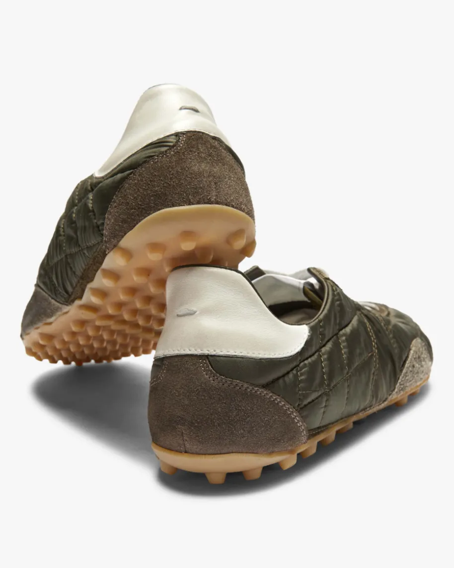 Sneaker für Herren von Maison Margiela in Oliv und Weiß. Das Modellpräsentiert sich dank der Fußball-Aufmachung als sportives Piece, während dasgesteppte Design sowie der Used-Look ein modisches Gesamtbild schaffen.