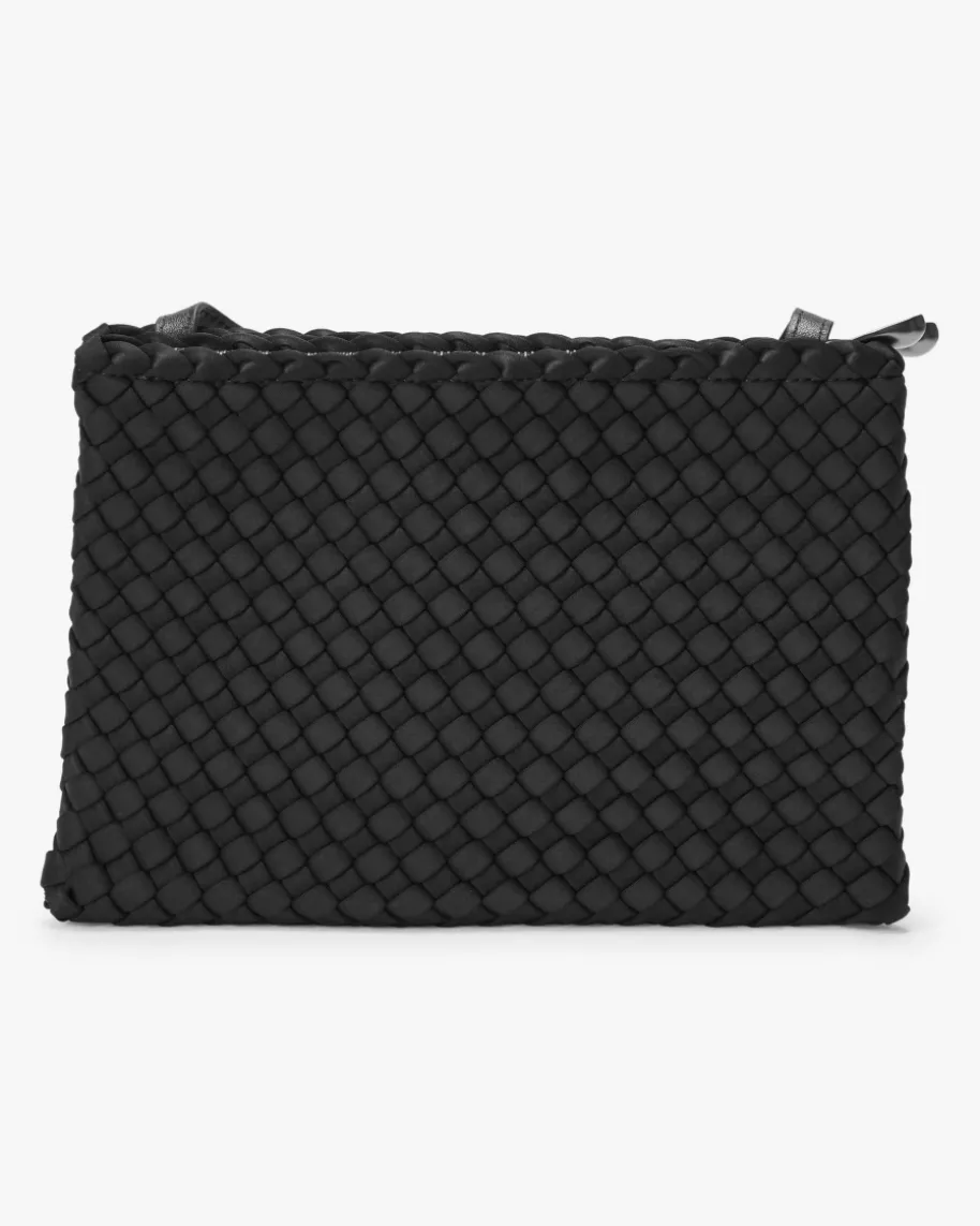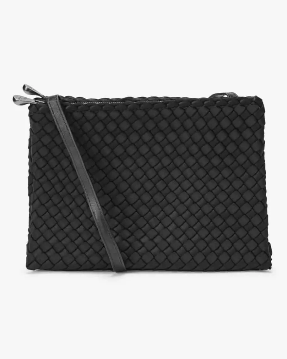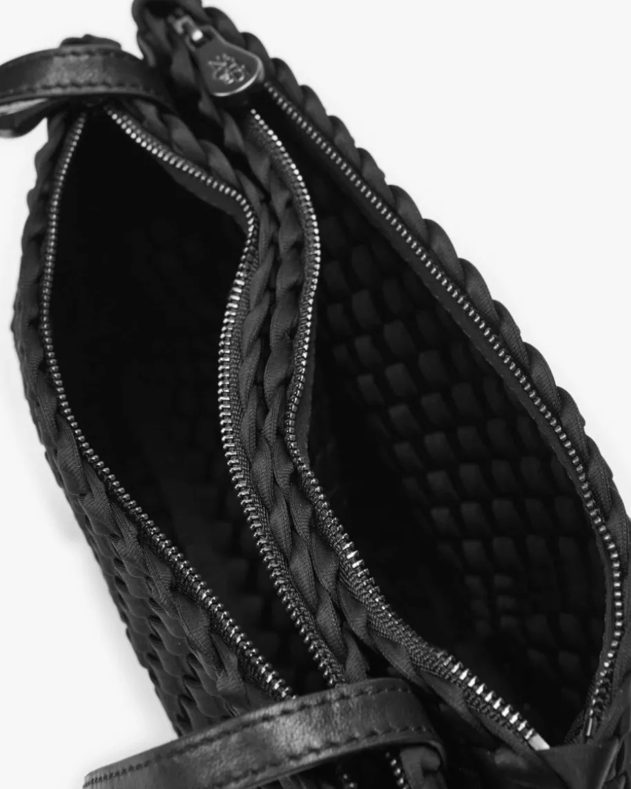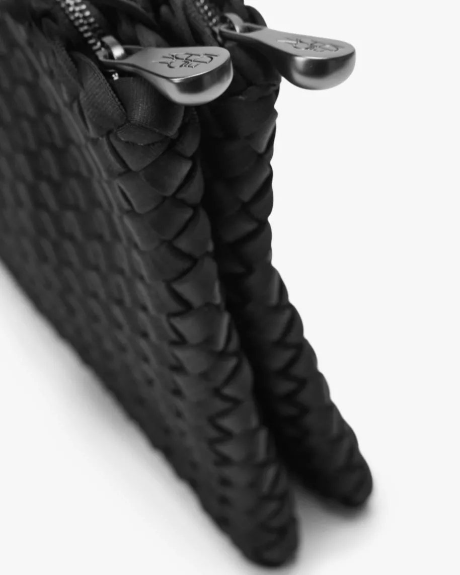 Soho Medium Messenger Umhängetasche für Damen von Naghedi in Schwarz. Diesestextile Modell präsentiert sich in dezent changierender Optik und edler Flecht-Aufmachung, während das doppellagige Design mit zwei gleichen, flachenReißverschluss-Taschen einen raffinierten wie auch praktischen Begleiterkreiert.