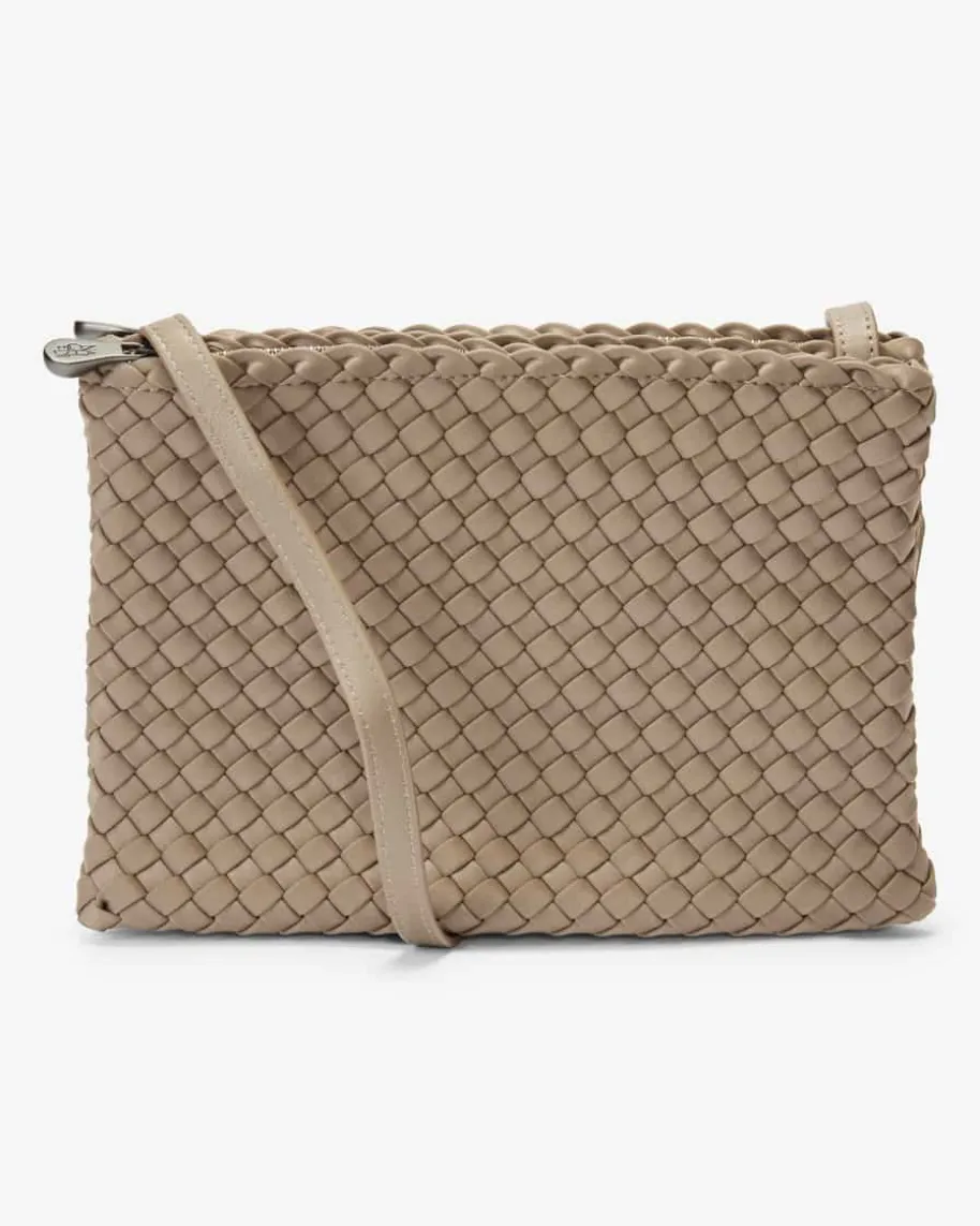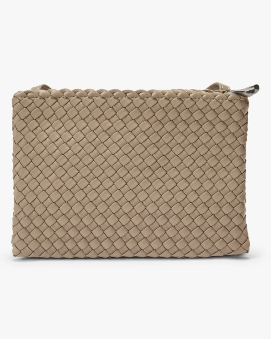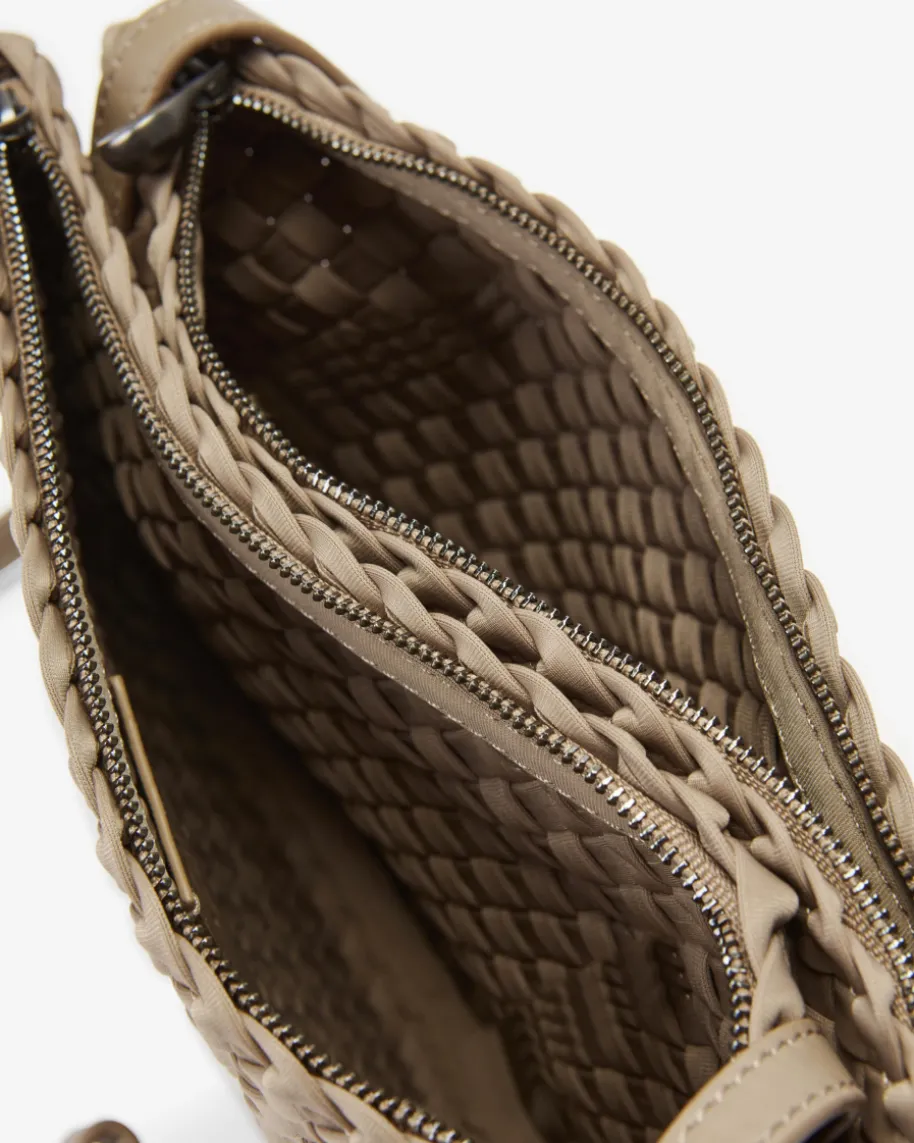 Soho Medium Messenger Umhängetasche für Damen von Naghedi in Beige. Diesestextile Modell präsentiert sich in dezent changierender Optik und edler Flecht-Aufmachung, während das doppellagige Design mit zwei gleichen, flachenReißverschluss-Taschen einen raffinierten wie auch praktischen Begleiterkreiert.