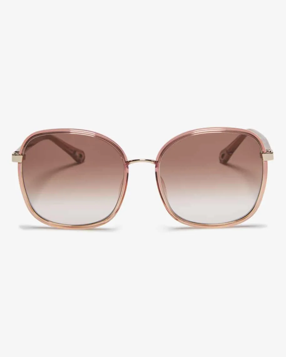 Sonnenbrille für Damen von Chloé Eyewear in Altrosa, Braun und Gold. Dankabgerundeter Gläser und der extragroßen Form mit schmalen Bügeln avanciert dasModell zum modernen Begleiter für den Sommer, während der semi-transparenteFarbverlauf den sonnigen Charakter gekonnt vollendet.