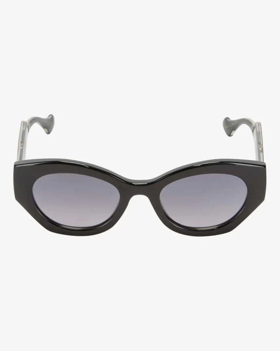 Sonnenbrille für Damen von Gucci Eyewear in Schwarz und Gold. Dieses Modellavanciert dank dem markanten Rahmen mit ovalen Gläsern zum trendsicherenAccessoire für sonnige Tage. Zugleich kreieren die Horn-Optik sowie diegoldfarbigen Logo-Details einen besonderen Blickfang.