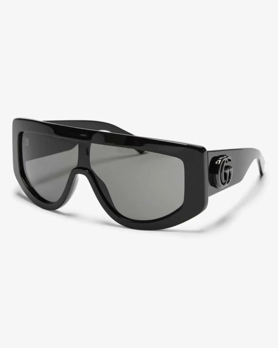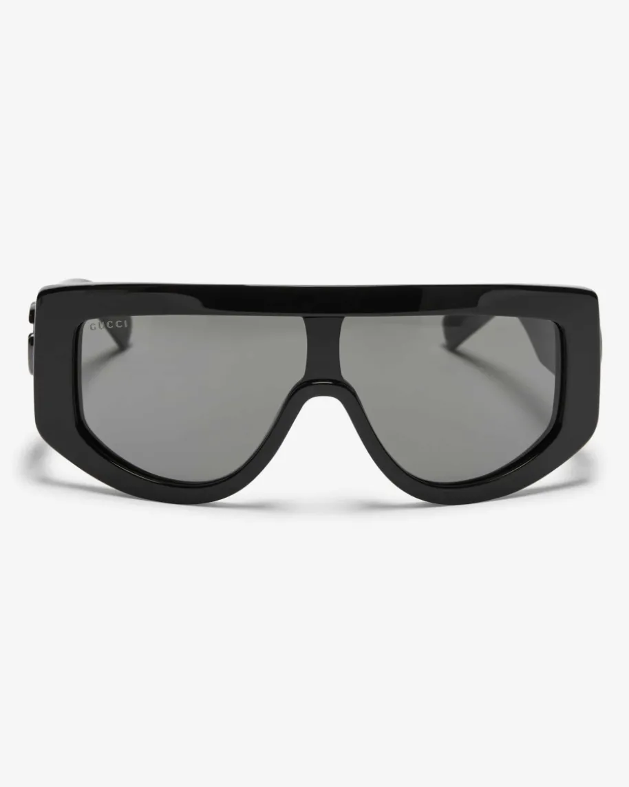 Sonnenbrille für Damen von Gucci Eyewear in Schwarz. Dank extravaganter, eckigerForm imsportiv interpretierten Aviator-Style avanciert das Modell mit breitem Rahmenzum modischen Begleiter für sonnige Tage. Die seitlichen Logo-Applikationen inChrom-Optik runden die Brille charakteristisch ab.