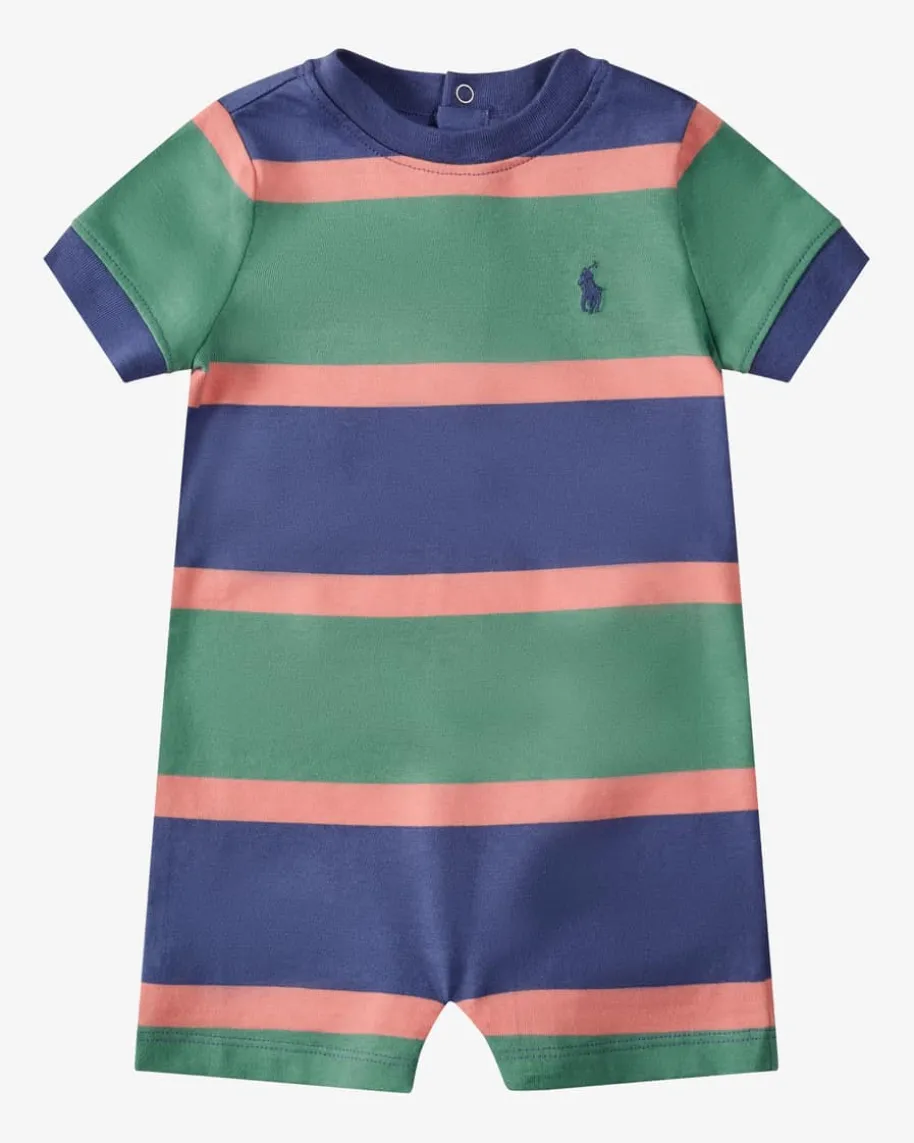 Spieler für Babys von Polo Ralph Lauren in Grün, Altrosa und Dunkelblau. DasModell präsentiert sich in komfortabler Jersey-Qualität mit kurzen Beinchen alsniedlicher Einteiler für Ihr Kleines, während das Streifenmuster zusammen mitder Logo-Stickerei den letzten Schliff verleiht.