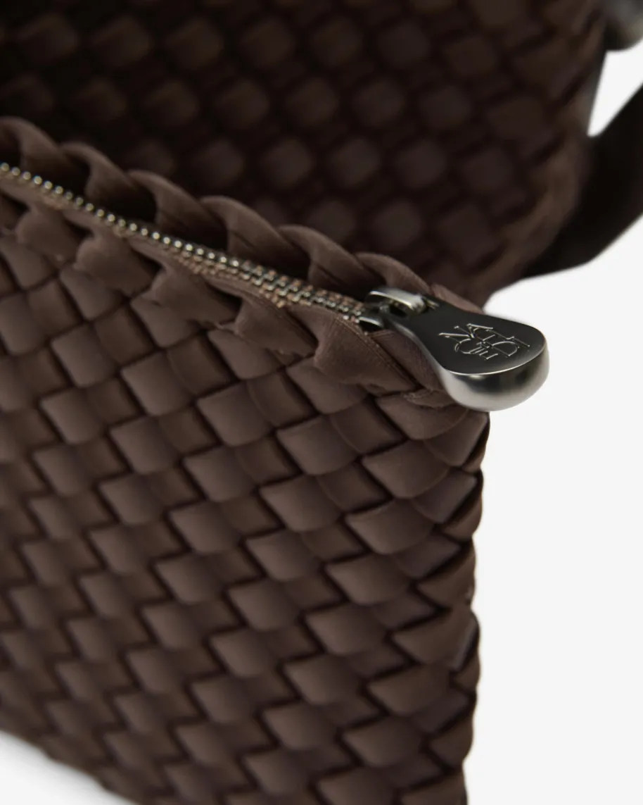 St. Barths Small Tote Handtasche für Damen von Naghedi in Schoko. Dieses textileModell präsentiert sich in changierender Optik und edler Flecht-Aufmachung,während das cleane Design für einen zeitlosen Look sorgt. Die separate Clutchist mit einem Reißverschluss versehen und bietet Platz für Ihre Kosmetikartikeloder andere Kleinigkeiten.