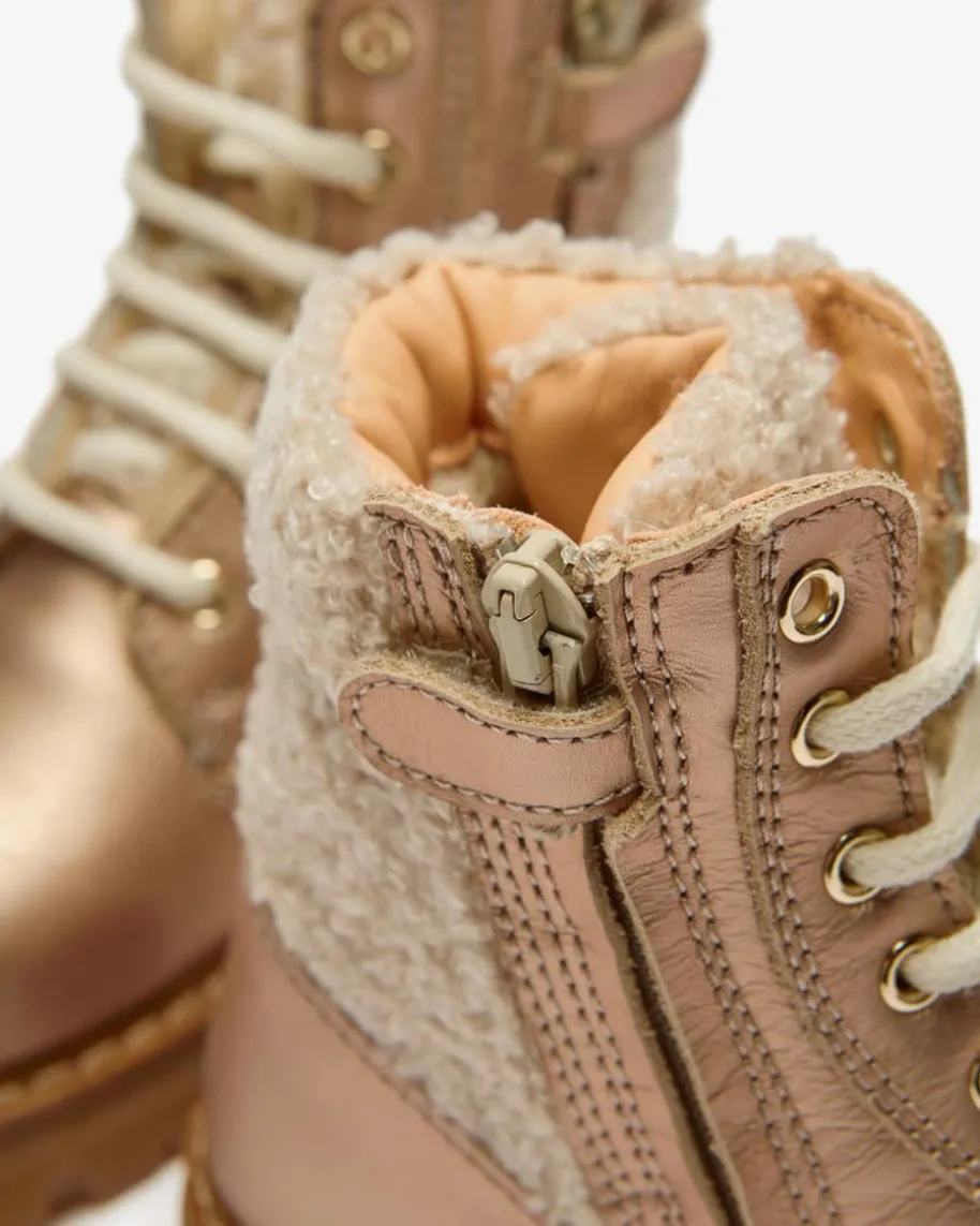 Stiefel für Kinder von Ocra in Beige und Gold. Gefertigt aus hochwertigem Lederund Bouclé-Material überzeugt das niedliche Modell, während das Lammfell-Innenfutter optimalen Tragekomfort verspricht und zugleich Schutz vor Kältebietet.