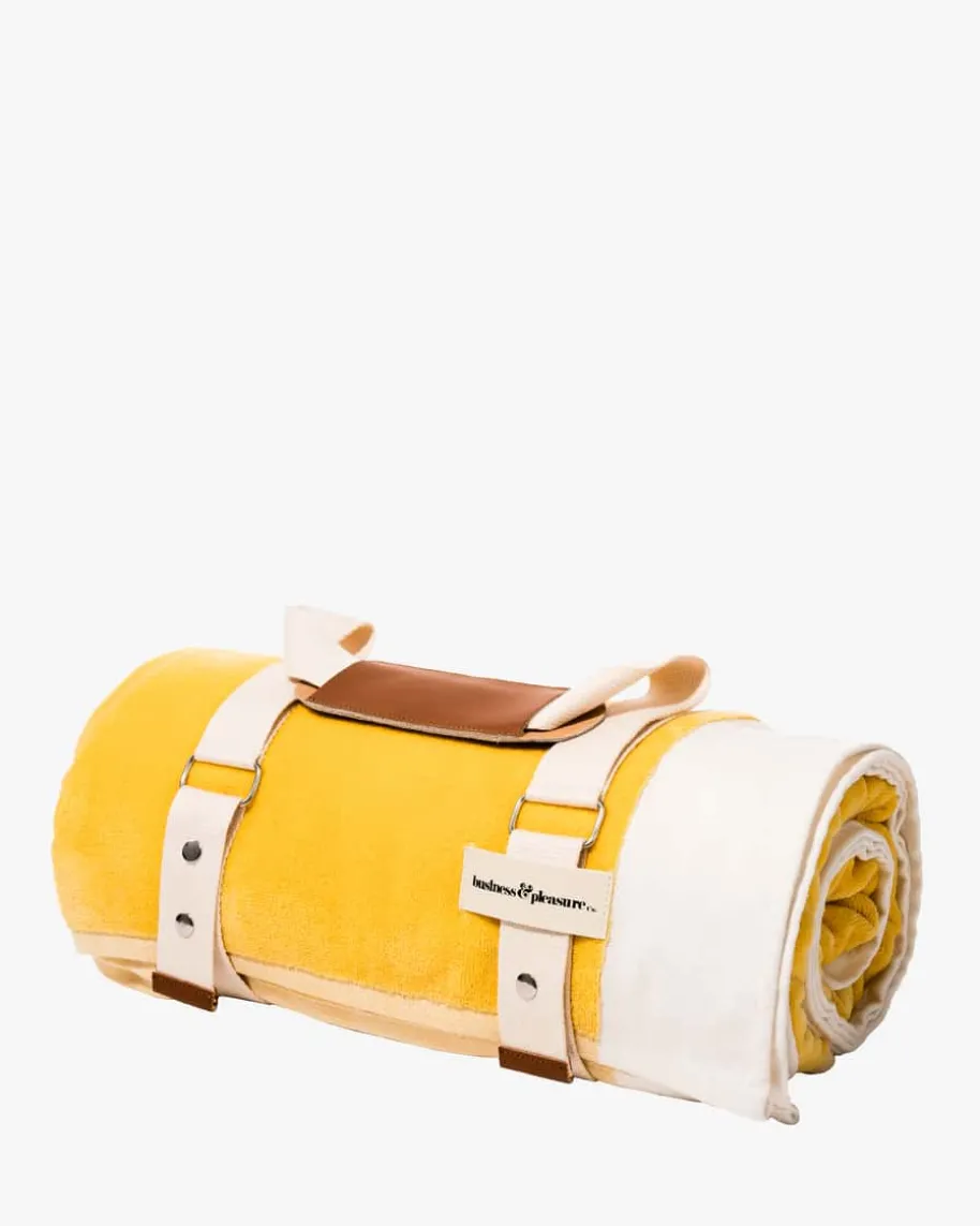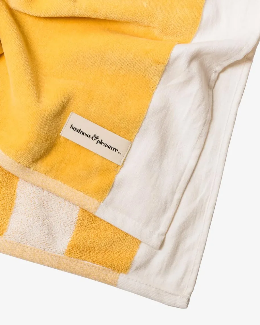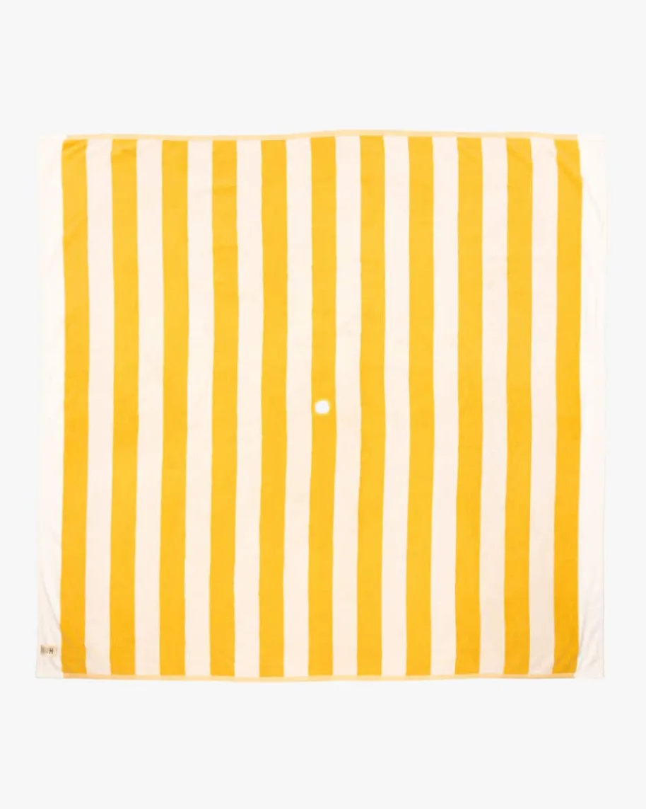 Strandtuch von Business & Pleasure in Gelb und Weiß. Das Modell präsentiert sichals familienfreundlicher Begleiter für sommerliche Badetage. Dank der Schließeaus Baumwolle und Leder punktet das Handtuch als funktionaler Favorit, der sicheingerollt einfach transportieren lässt. Das stilvolle Streifen-Dessin verleihtzudem ein modisches Vintage-Flair. Das Loch in der Mitte lässt Platz für einenSonnenschirm.