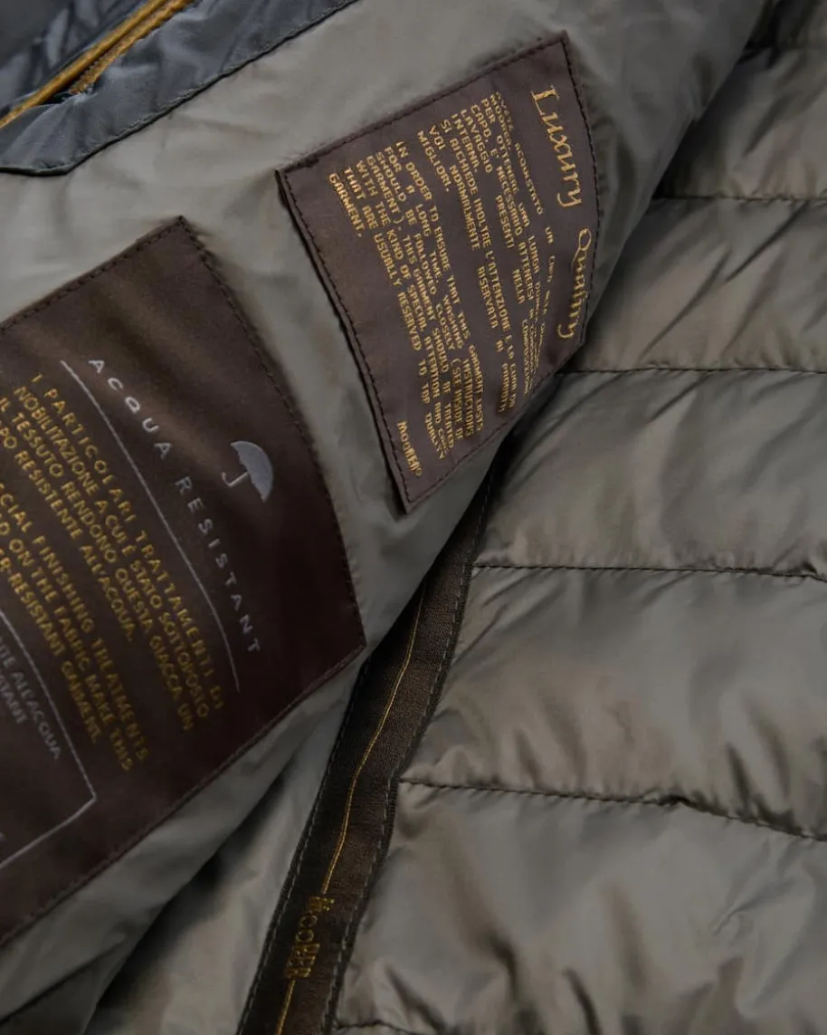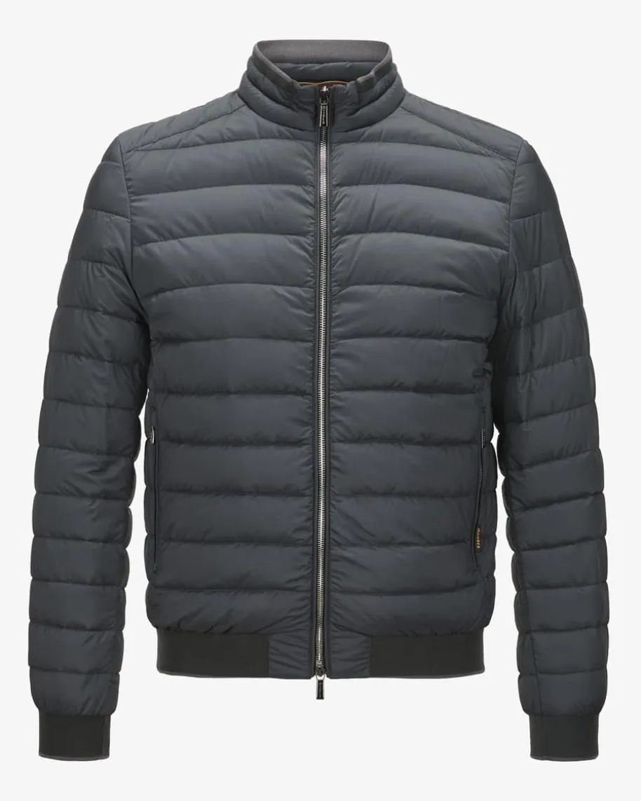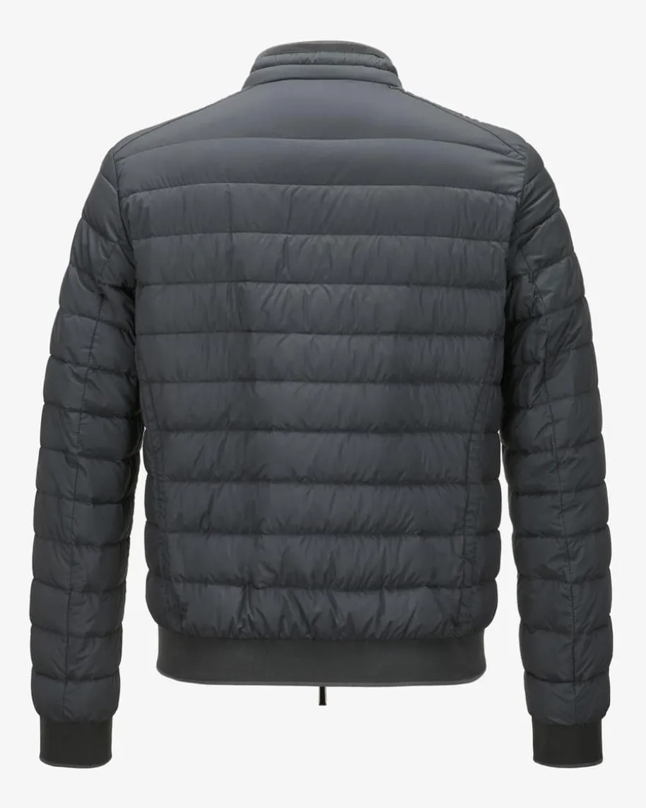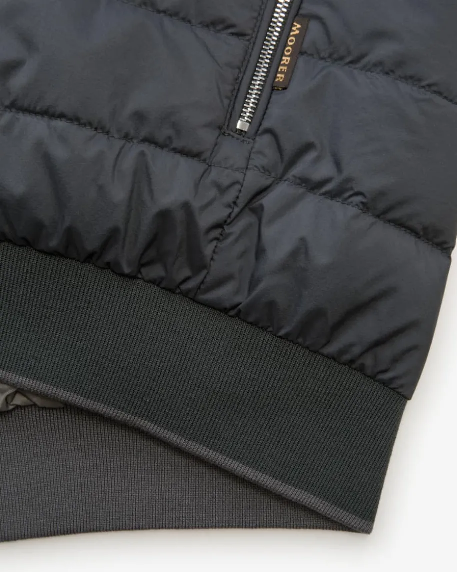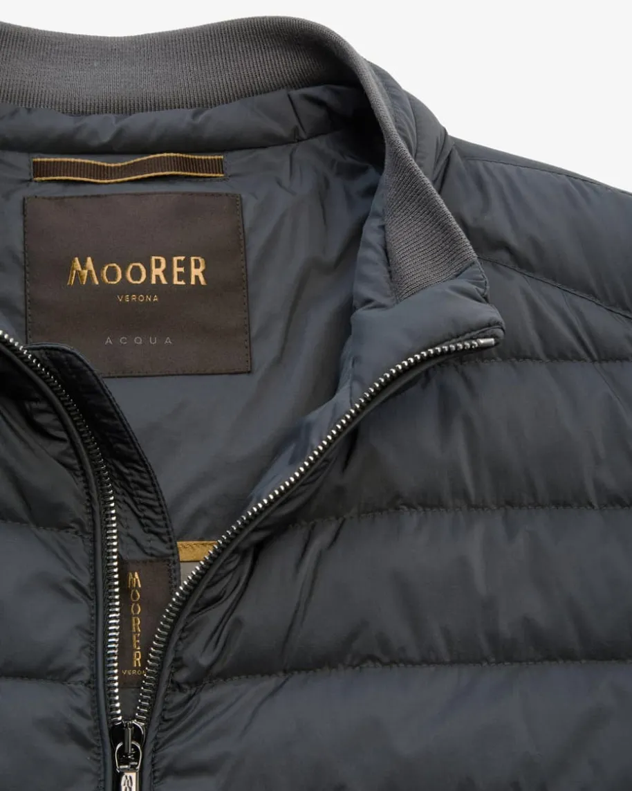 Strauss Daunenjacke für Herren von Moorer in Graugrün. DasModell mitchangierender Stepp-Optik überzeugt dank der hochwertigeDaunen-Feder-Füllungmit optimaler Wärmeisolierung, während Rippstrick-Detailseinen sportivenBlouson-Look kreieren.