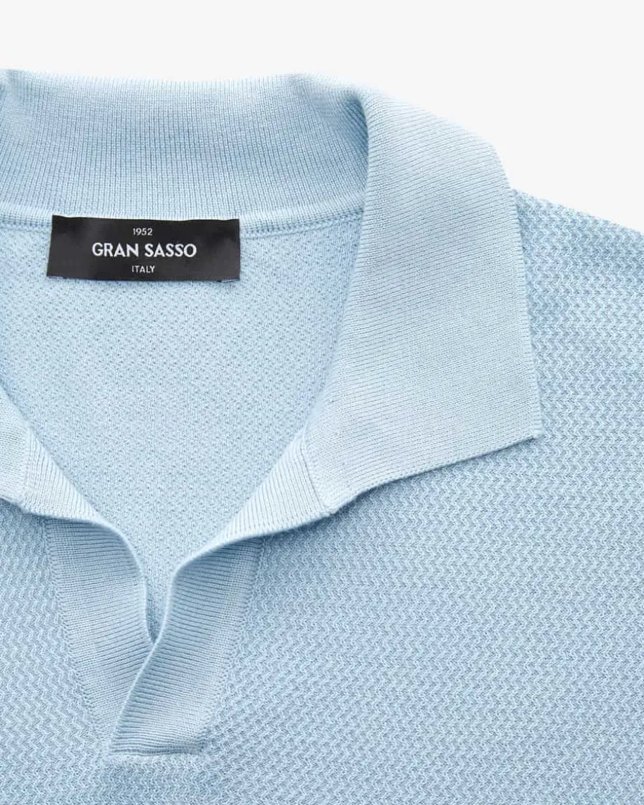 Strick-Poloshirt für Herren von Gran Sasso in Hellblau. Das fein gestrickteModell überzeugt mit der leichten Seiden-Baumwoll-Qualität, während die modischeWeb-Struktur dem Gesamtbild eine extravagante Note verleiht.