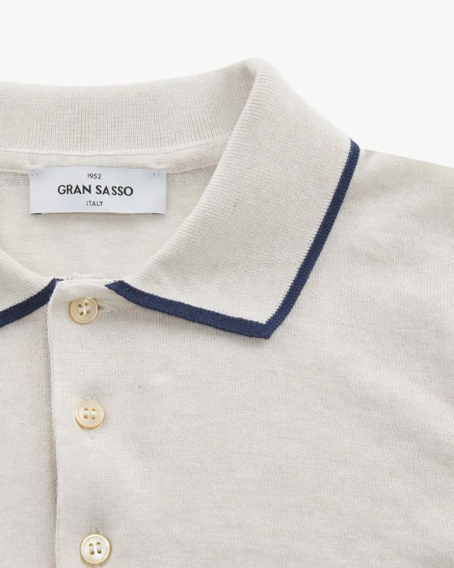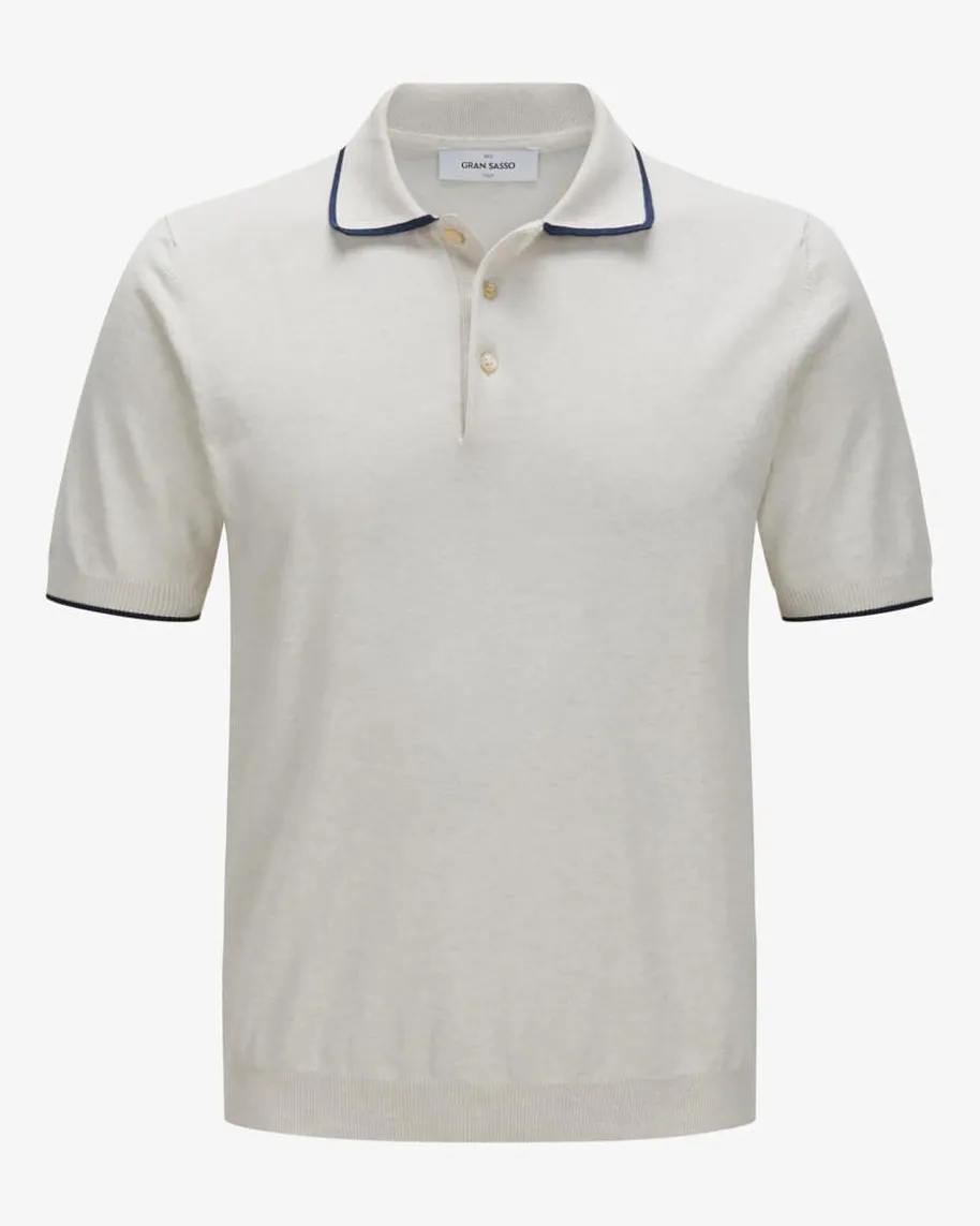 Strick-Poloshirt für Herren von Gran Sasso in Sand und Navy. Das Modell ausweicher Baumwolle präsentiert sich dank der Strick-Aufmachung als modischerFavorit mit angenehmer Haptik. Zugleich setzen Kontraststreifen gekonntAkzente..
