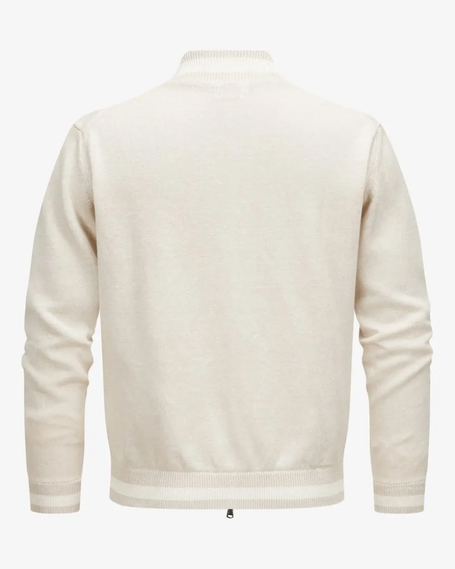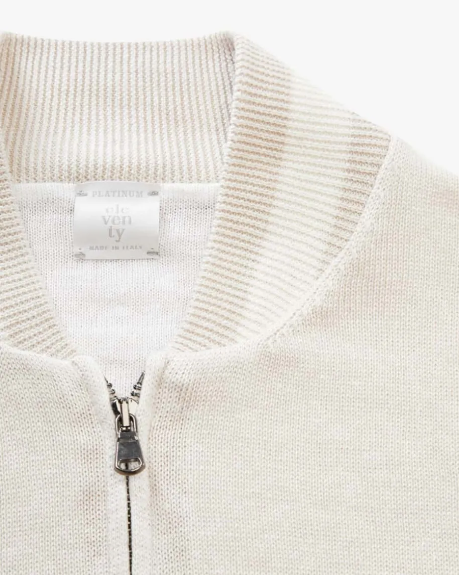 Strickblouson für Herren von Eleventy in Sand und Off-White. Das Modell bestichtdank der doppellagige Strickverarbeitung aus Leinen-Baumwoll-Mix sowohl haptischals auch optisch, während die Kombination aus legerem Strickjacken-Look undmodischer Blousonjacken-Aufmachung mit gestreiften Rippstrick-Bündchen einenvielseitigen Casual-Begleiter kreiert.