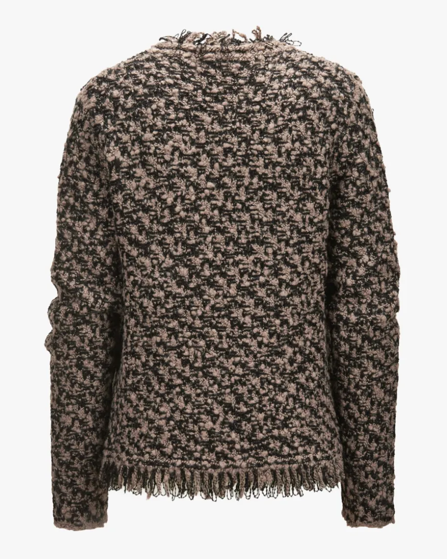 Strickjacke für Damen von Fabiana Filippi in Schwarz und Taupe. Die italienischeMarke steht für moderne Eleganz, hochwertige Materialien und dezente Farbwelten.Das Bouclé-Modell überzeugt sowohl haptisch als auch optisch in angenehmem Woll-Mix, während eingearbeitete Pailletten- und Fransen-Details einen eleganten Lookzaubern.