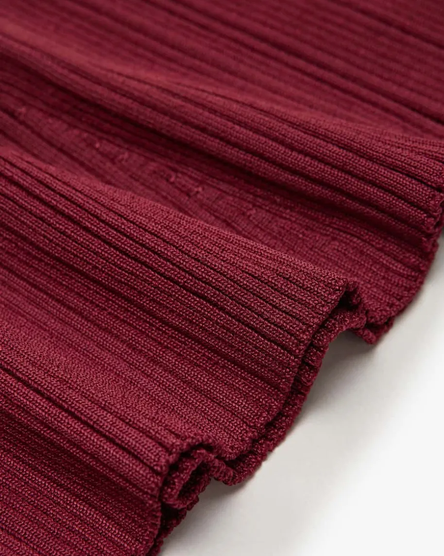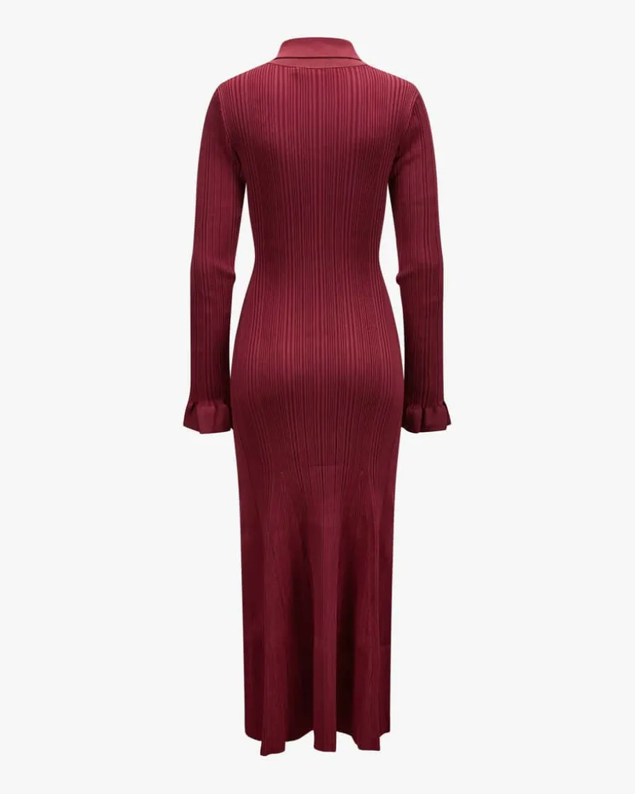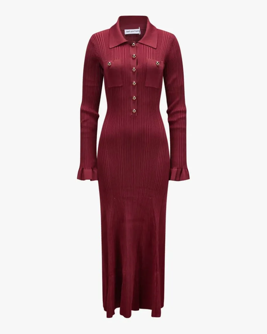 Strickkleid für Damen von Self-Portrait in Burgund. Das Londoner Label steht fürmoderne Cocktailkleider mit Spitze, Cut-Outs und femininer Detailverliebtheit.Auch dieses schmale Modell präsentiert sich mit raffinierten Rippstrick-Verarbeitung, während die edel changierenden Knöpfe und die femininen Rüschen-Details einen modischen Look mit dem gewissen Etwas schaffen.