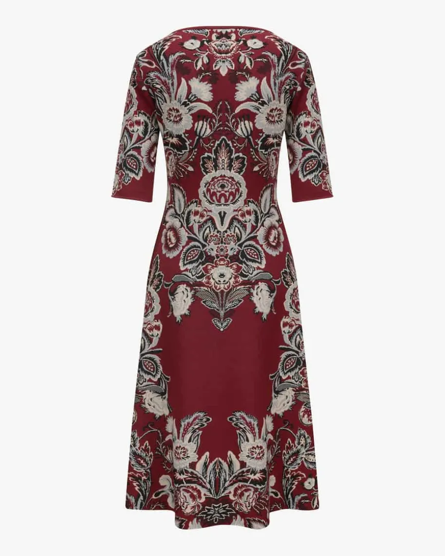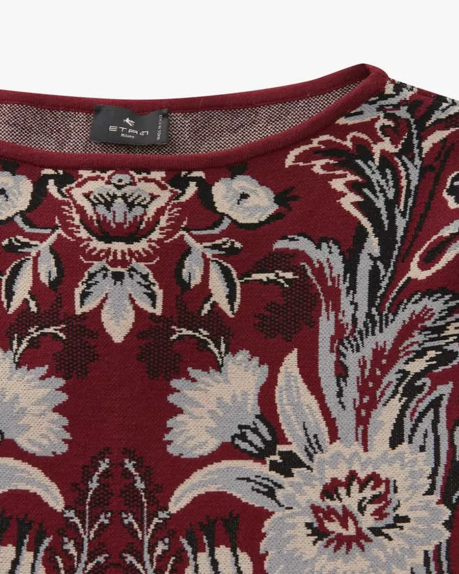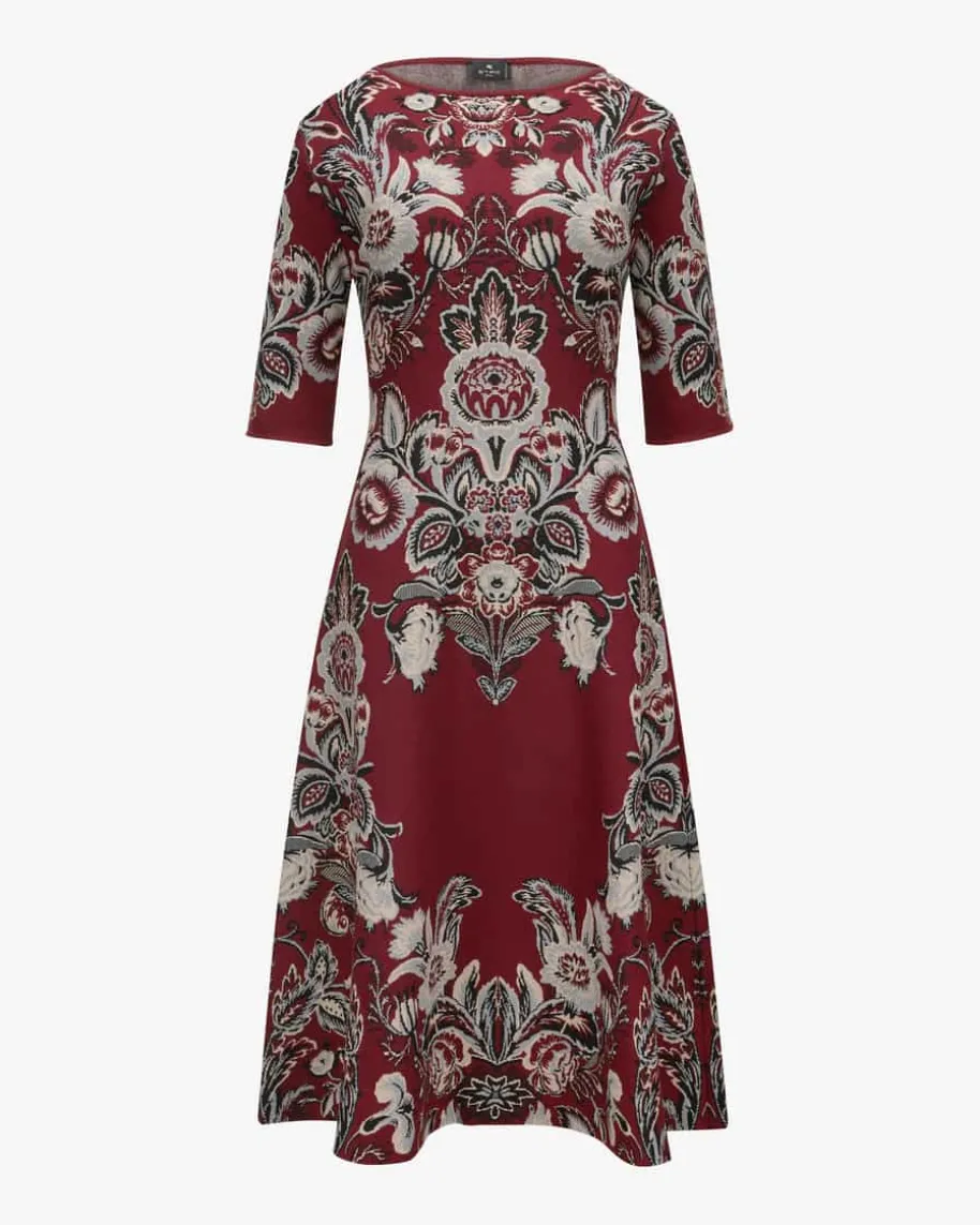Strickkleid für Damen von Etro in Bordeaux, Blaugrau und Schwarz. Während dieausgestellte Passform sowie elastische Strick-Qualität einen femininen Schwungkreiert und hohen Tragekomfort verspricht, begeistert das Modell zudem durch dasflorale Jacquard-Design mit romantischem Touch.