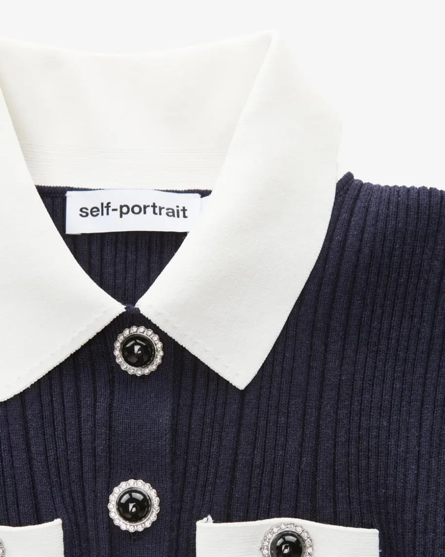 Strickkleid für Damen von Self-Portrait in Navy und Weiß. Das Londoner Labelsteht für moderne Cocktailkleider mit Spitze, Cut-Outs und femininerDetailverliebtheit. Auch dieses Modell begeistert mit schmaler Rippstrick-Verarbeitung mit edel changierenden Schmuckknöpfen, während klassischeHemdblusen-Details und markante Paspeltaschen den femininen Hingucker-Lookgekonnt abrunden.