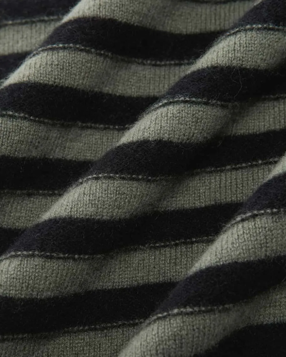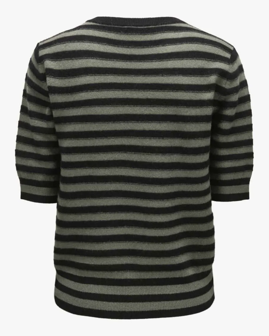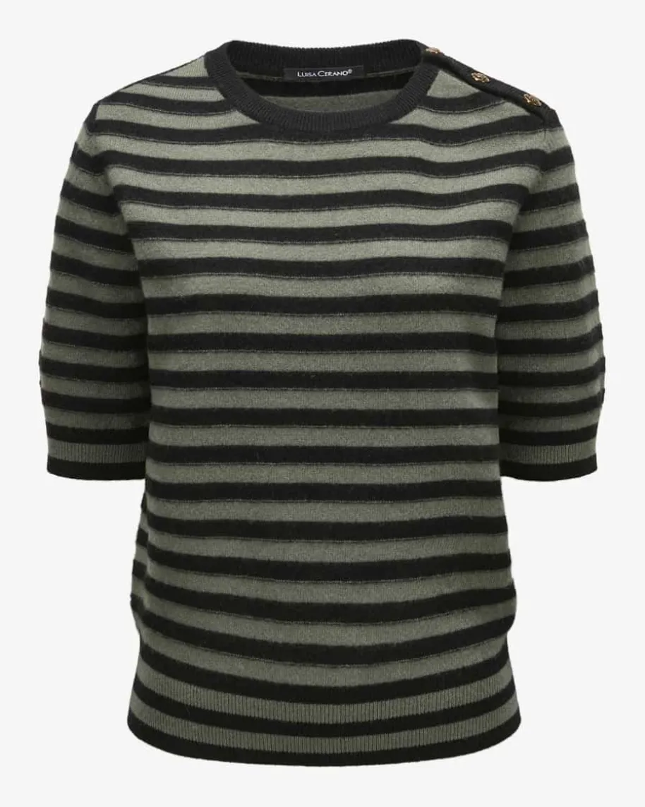 Strickshirt für Damen von Luisa Cerano in Khaki und Schwarz. Das gestreifteModell aus hochwertigem Woll-Cashmere-Mix avanciert dank der feinen Strick-Verarbeitung zum zeitlosen Favoriten, welcher durch die dekorativen,goldfarbenen Wappenknöpfe an der Schulterpartie eine besondere Note im maritimenStil erhält.