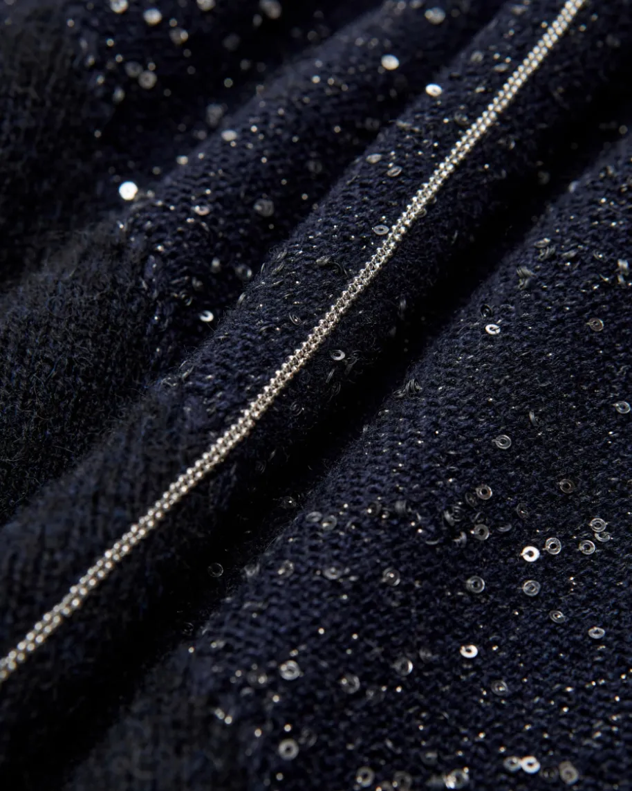 Strickshirt für Damen von Peserico in Navy. Die italienische Marke steht fürfeine Damenmode mit Fokus auf Materialien, Passform und Handwerkskunst. Auchdieses kurzärmlige Modell präsentiert sich mit grafischer Strick-Verarbeitungaus hochwertigem Schurwoll-Cashmere-Seiden-Mix, während changierende Paillettenund feine Ketten-Applikationen einen modischen Look mit dem gewissen Etwasschaffen.