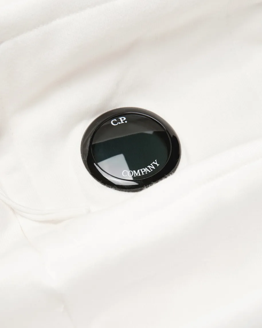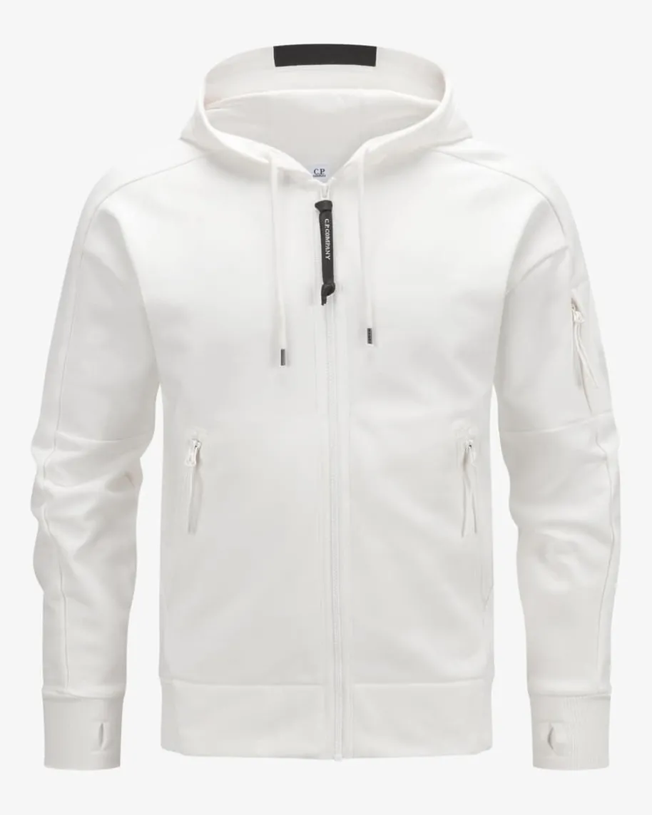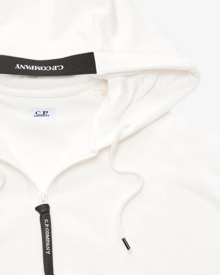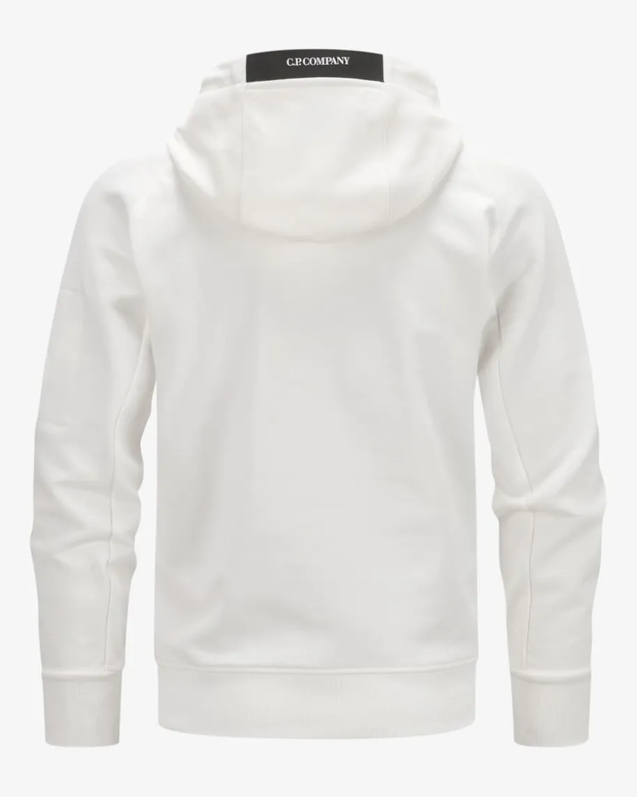 Sweatjacke für Herren von C.P. Company in Weiß und Schwarz. Das Modell aussofter Baumwolle punktet dank der klassischen Hoodie-Aufmachung mitkontrastfarbigen Logo-Details im sportiven Look, welcher durch die diagonaleNahtführung harmonisch abgerundet wird.