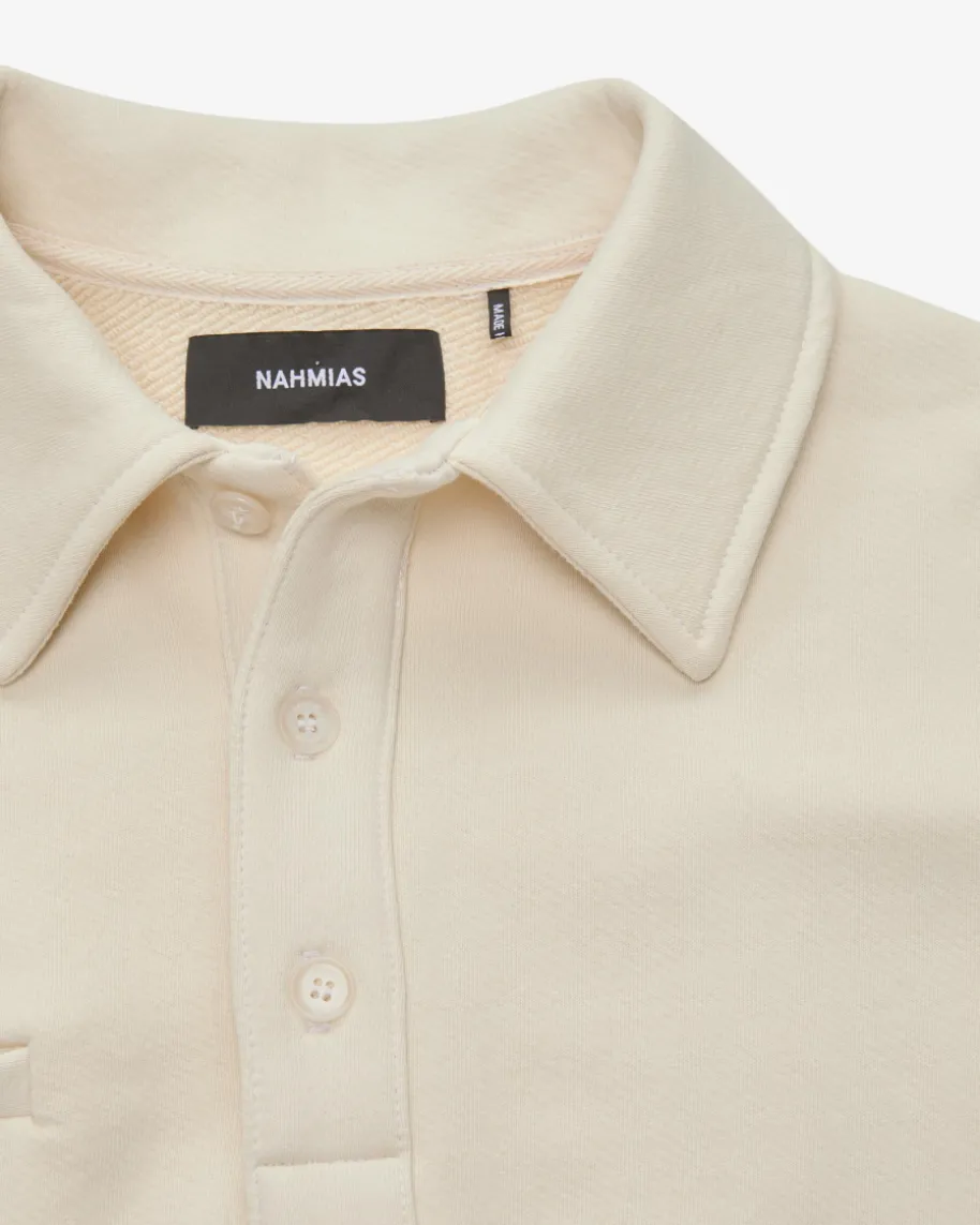 Sweatshirt für Herren von Nahmias in Creme. Das US-Streetwear-Label mit Wurzelnin Kalifornien – luxuriös, sportlich, Westcoast-cool. Auch dieses Modellbegeistert in sportiver Aufmachung und markanten Logo-Applikationen, während derklassische Polokragen und die verkürzte Knopfleiste den Look in gekonntabrunden.
