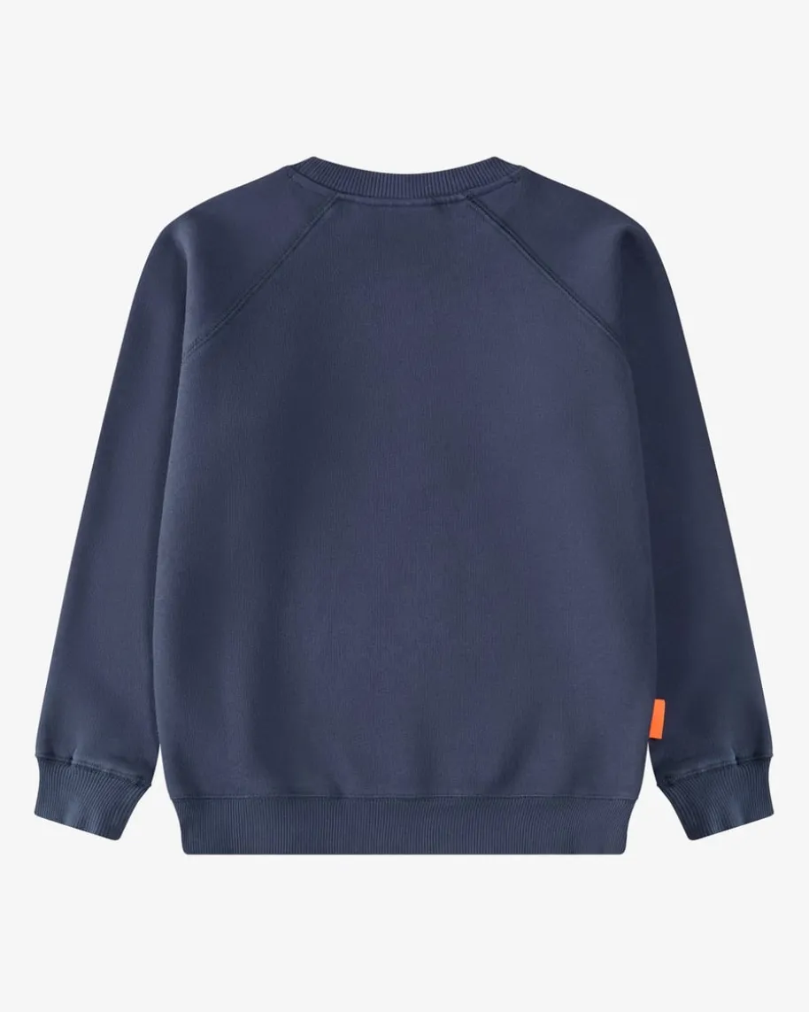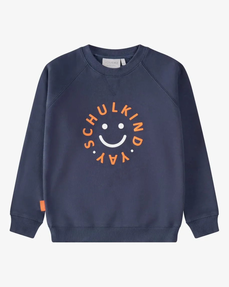 Sweatshirt für Kinder von Von Rike in Navy, Orange und Weiß. Das Modell punktetdankhochwertigem Baumwoll-Mix mit flauschiger Innenseite mit angenehmenTragemomenten, während der Schulkind-Schriftzug einen süßen Casual-Look kreiert.