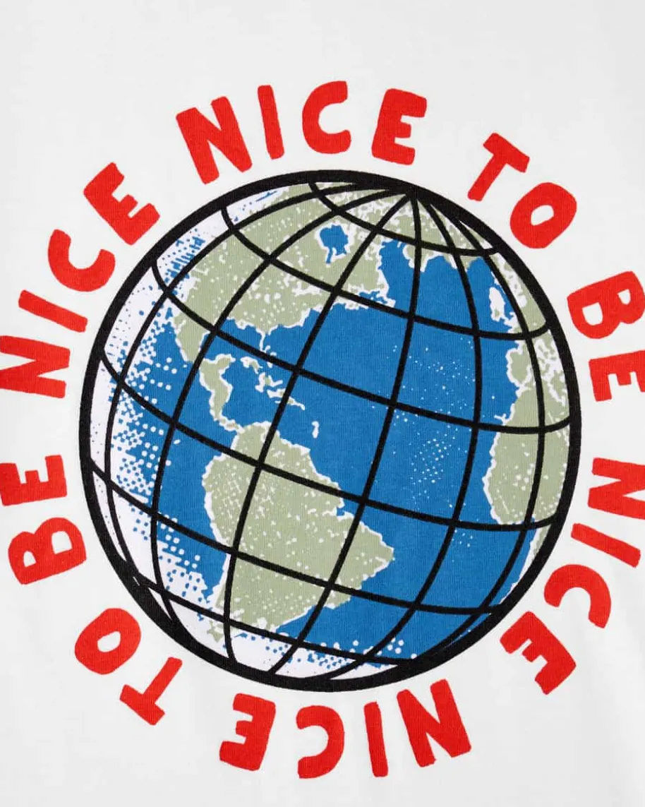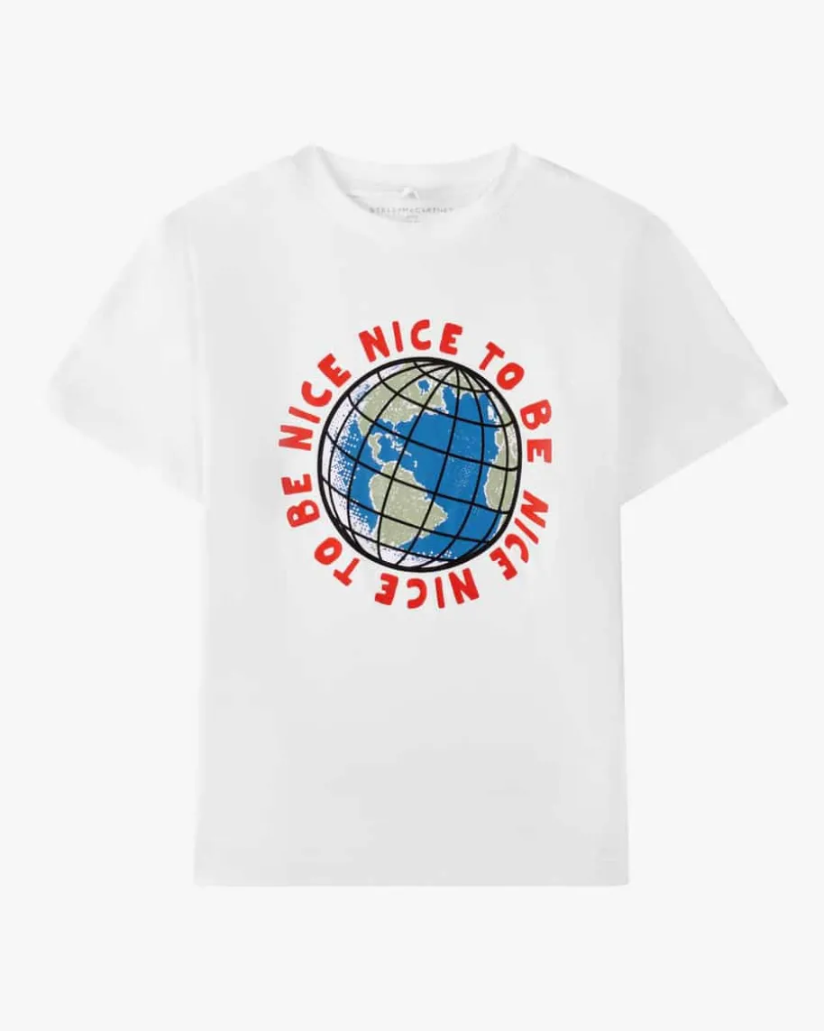 T-Shirt für Jungen von Stella McCartney in Weiß, Blau und Rot. Das Modellpräsentiert sich in legerer Aufmachung, welche durch den Weltkugel-Print mitSchriftzug modern unterstrichen wird.