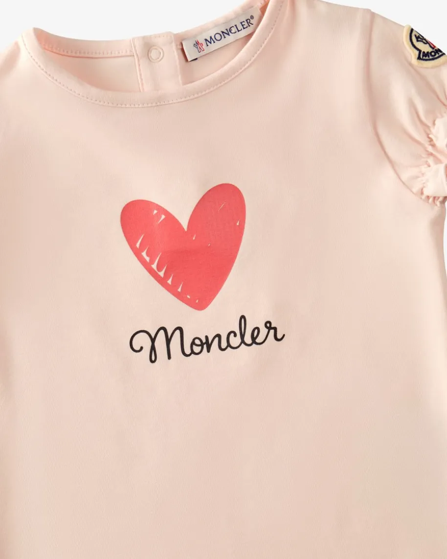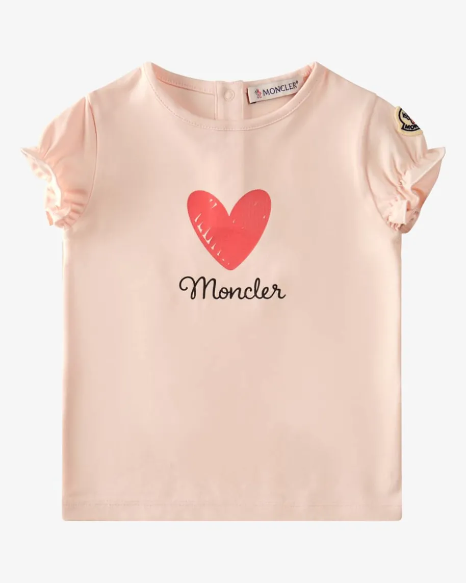 T-Shirt für Babys von Moncler Enfant in Rosa. Das Modell überzeugt dankhochwertiger Baumwoll-Qualität, während die geknöpfte Rückseite ein An- undAusziehen erleichtert und der niedliche Herz-Logo-Print das Gesamtbildharmonisch abrunden.
