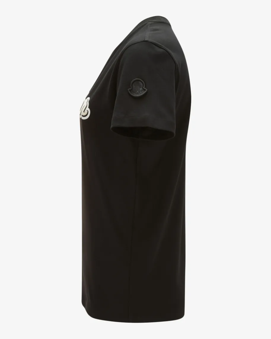 T-Shirt für Damen von Moncler in Schwarz. Die angenehme Baumwoll-Qualitätverleiht hohen Tragekomfort, während der kontrastierende Schriftzug in Samt-Optik sowie die tonale Logo-Applikation für besondere Akzente sorgen.