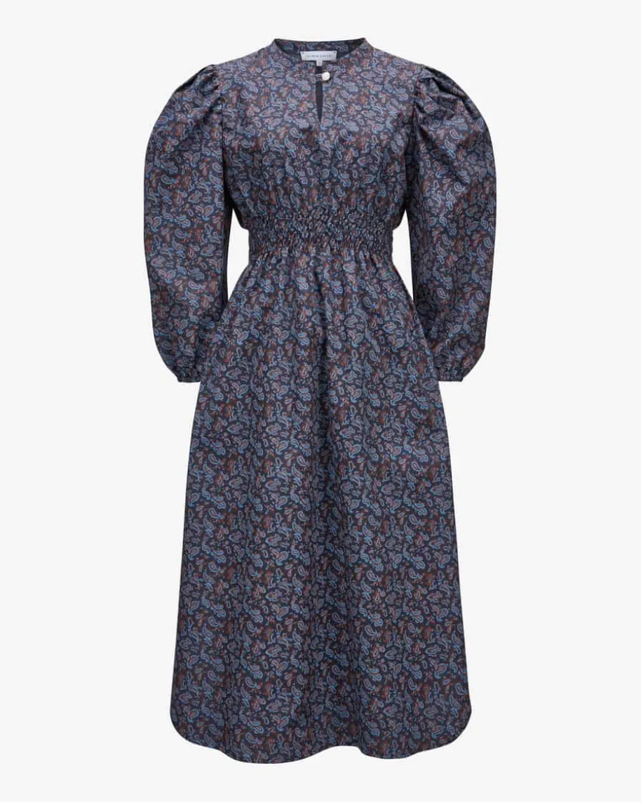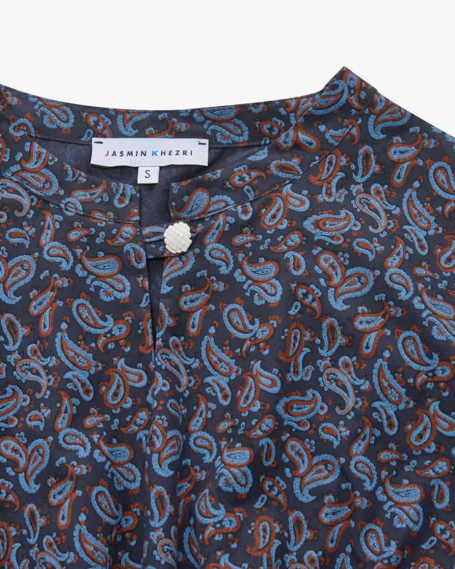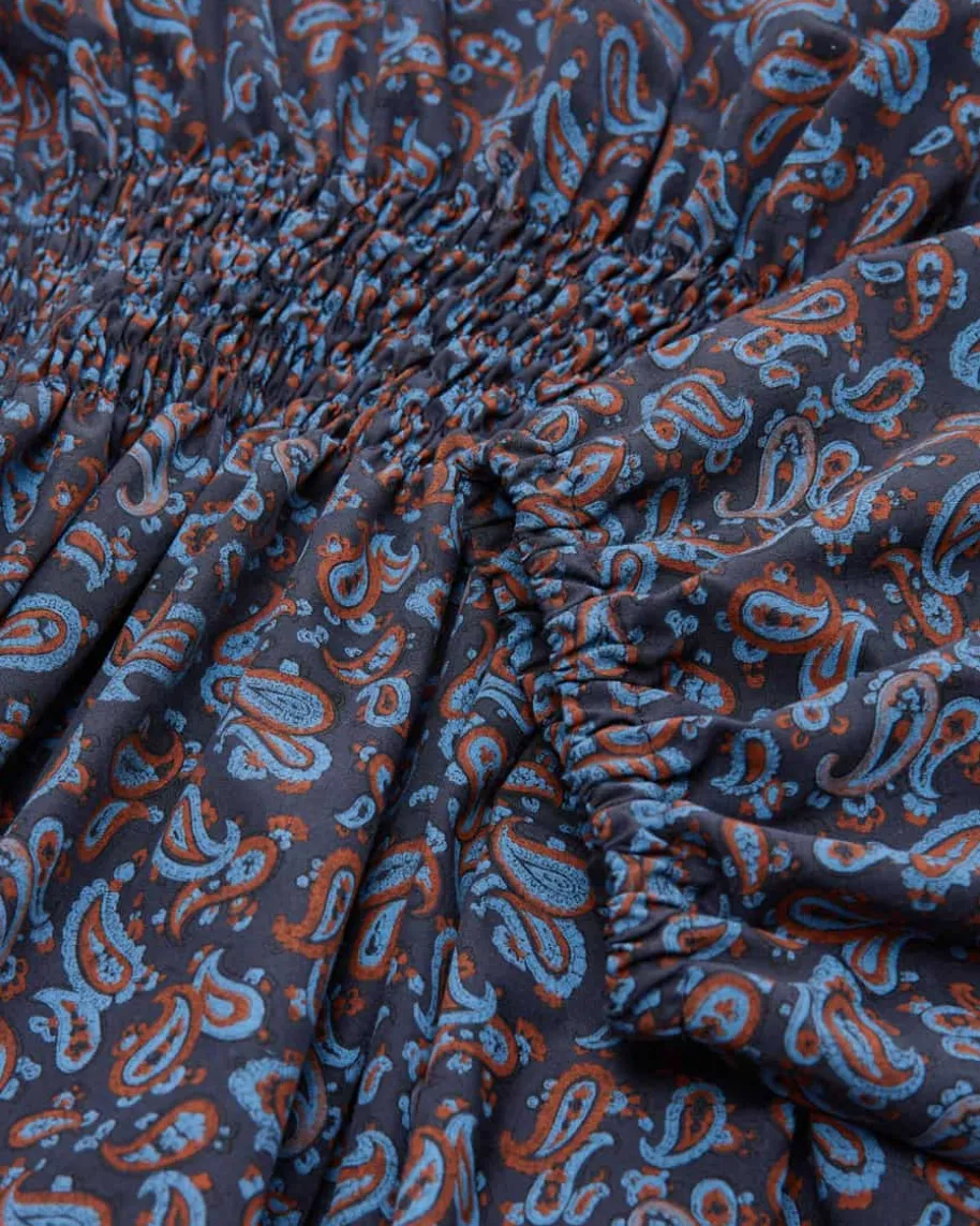 Taroudant Kleid für Damen von Jasmin Khezri in Dunkelblau, Terrakotta und Blau.Jasmin Khezri ist eine deutsche Künstlerin und Illustratorin, die unter demPseudonym „IRMA“ Mode, Kunst und Lifestyle vereint. Auch dieses Modell überzeugtmit stilvollem Paisley-Muster und avanciert dank raffiniert gesmokter Taille zummodischen Blickfang im Boho-Look.
