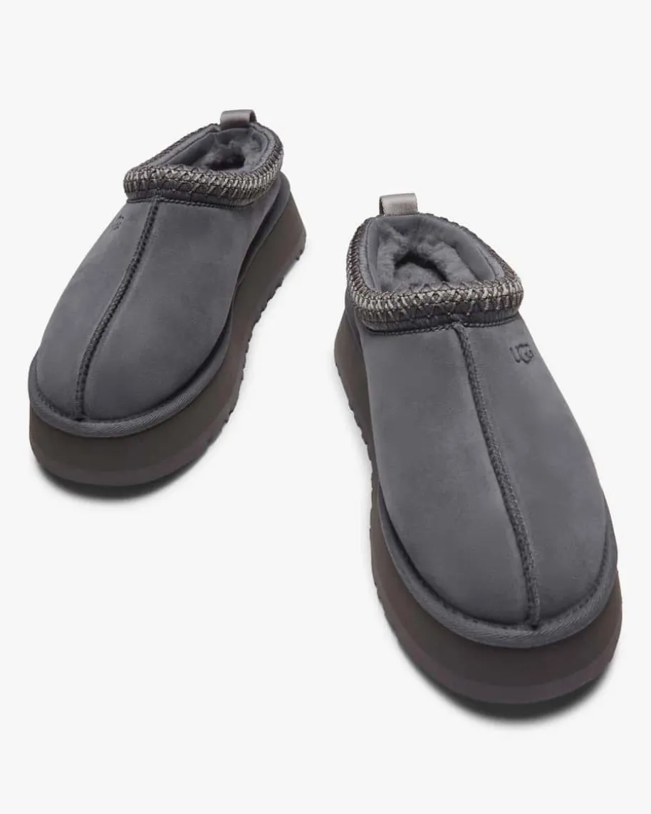Tazz II Pantoletten für Damen von Ugg in Anthrazit. Das Modell des Kult-Labelsüberzeugt dank des weichen Lammfell-Futters mit hohem Wohlfühl-Faktor, währenddas hochwertige Veloursleder ein zeitloses Design kreiert. Zusätzlich rundet dastasmanische Flecht-Detail den Schuh modisch ab.