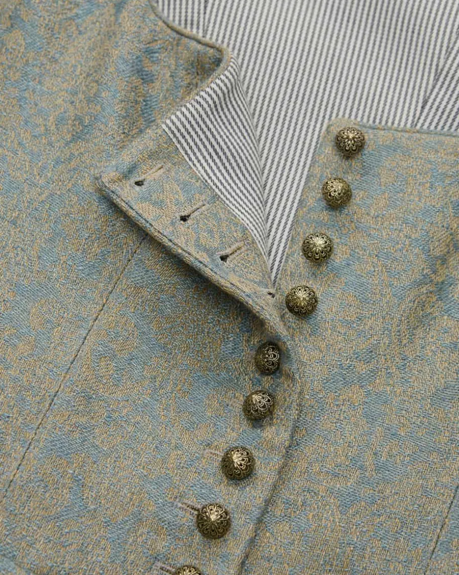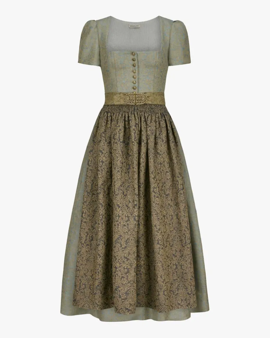 Tessa Leinendirndl lang mit Schürze von Gottseidank in Graublau, Anthrazit undOcker. Das Modell besticht dank des floralen Allover-Dessins als traditionellerFavorit in femininer Aufmachung, während klassische Details einen stilvollenFavoriten für festliche Anlässe kreieren. Die hochwertige Leinen-Qualitätpunktet zugleich mit einer angenehmen Haptik.