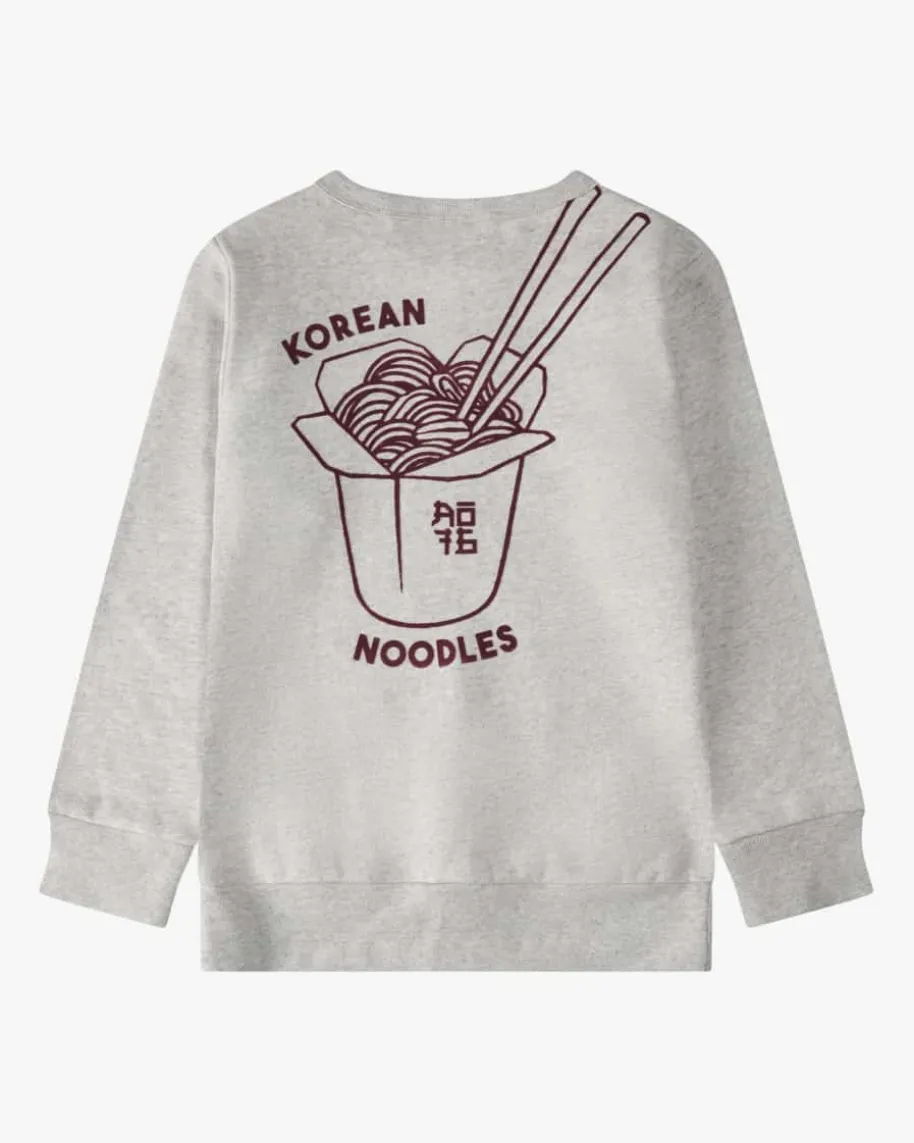 Tom Sweatshirt für Jungen von AO76 in Hellgrau und Bordeaux. Das legere Modellbegeistert mit hochwertigem Baumwoll-Sweat und weicher Innenseite, während derrückseitige, samtige Flock-Print mit Korean Noodles Motiv den modernen Stylegekonnt abrundet.