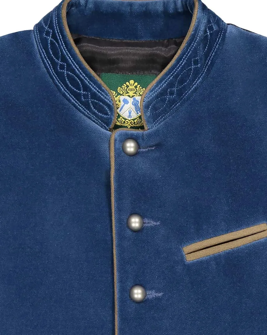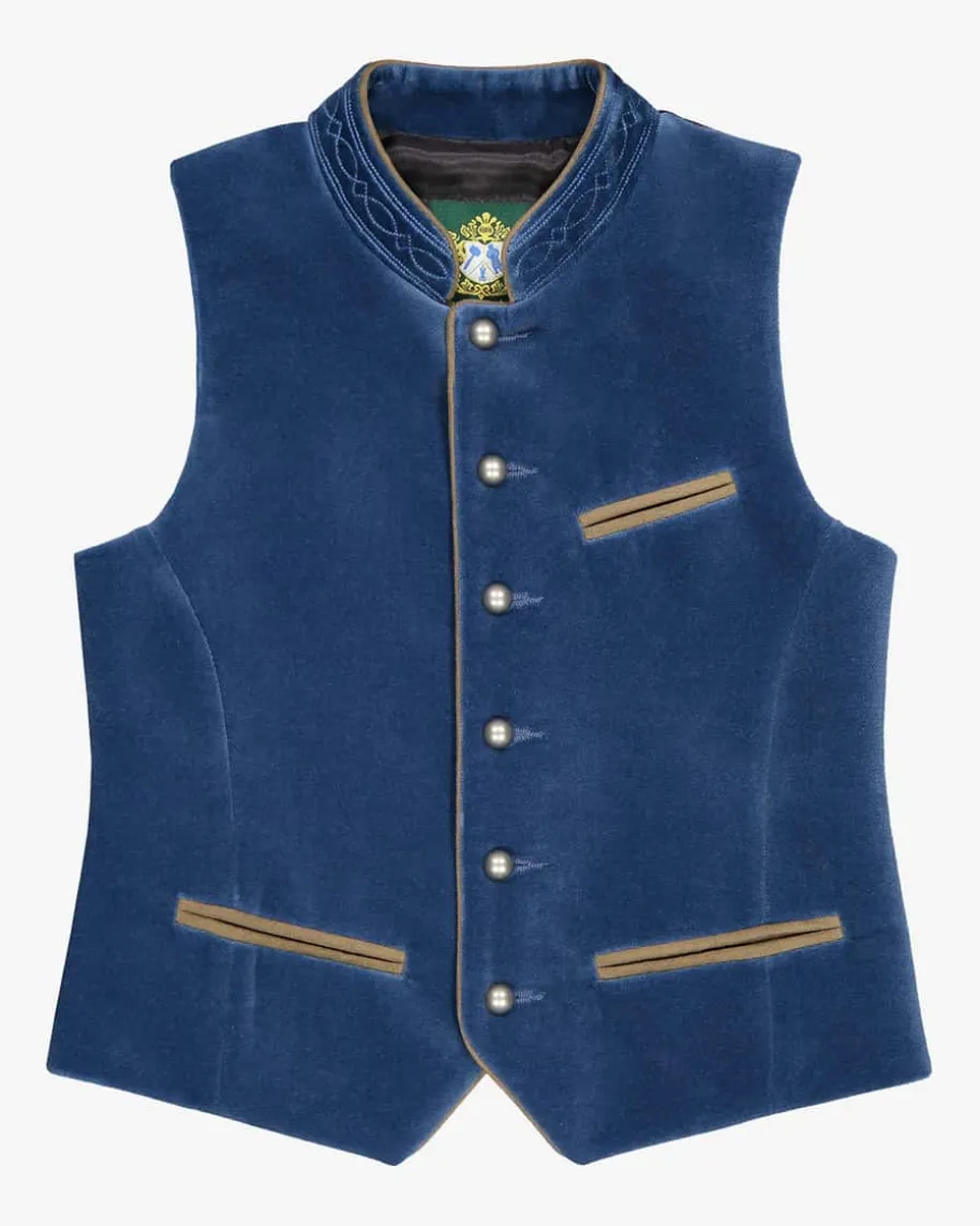 Toni Jungen-Trachtenweste von Hammerschmid in Blau und Schwarz. Klassischgeschnitten und mit verstellbarem Taillenriegel auf der kontrastierendenRückseite versehen, überzeugt die Weste durch die edle Samtpartie auf derVorderseite.