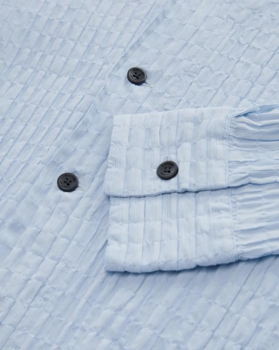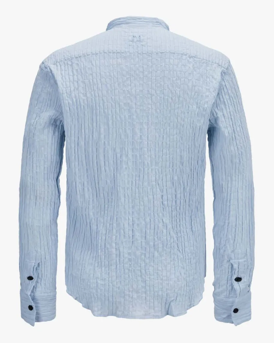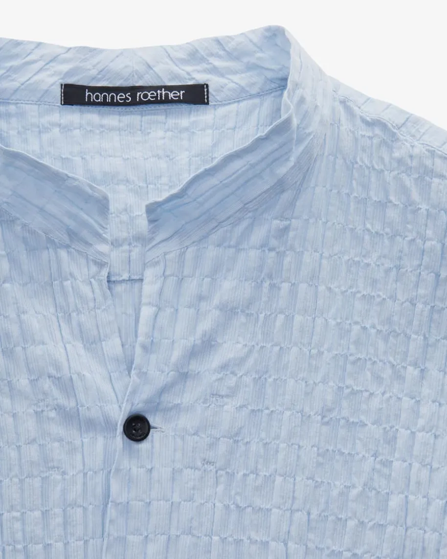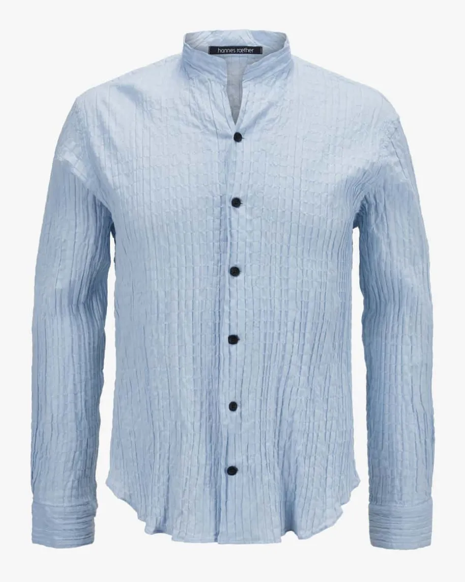 Hemd für Herren von Hannes Roether in Hellblau. Das Modell besticht mit dezentgesmokter, elastischer Material-Qualität, während ein Stehkragen mit V-Ausschnitt und kontrastierende Knöpfe einen modernen Touch verleihen.