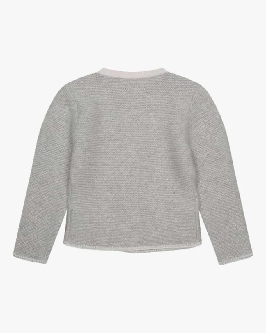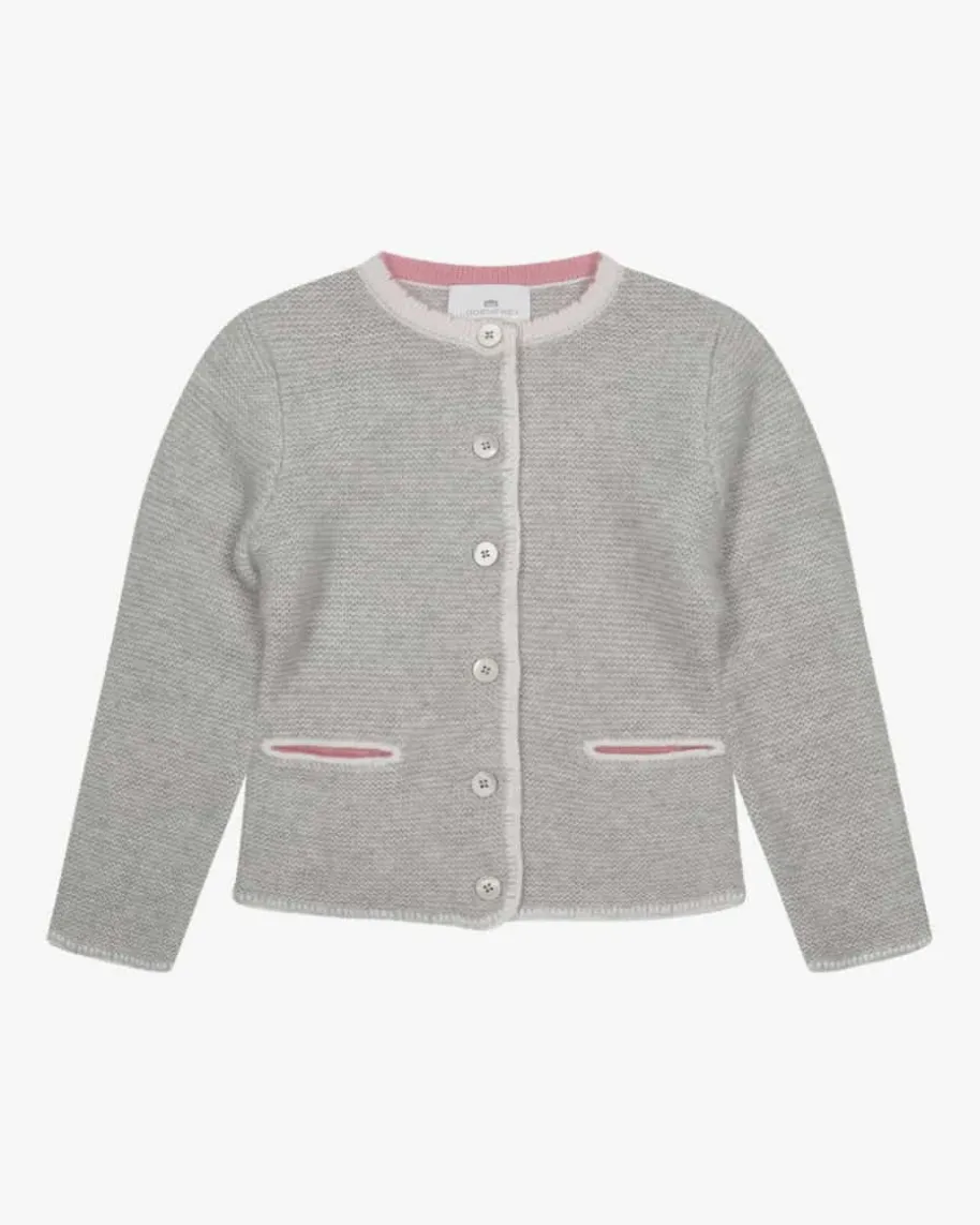 Trachten-Cashmere-Strickjacke für Mädchen von LODENFREY in Hellgrau und Creme.Verwöhnen Sie Ihr Kind mit weicher Cashmere-Verarbeitung und besondersangenehmer Haptik, währenddas traditionelle Strick-Design mit farbig abgesetzten Kanten einen stilvollenBegleiter kreiert.