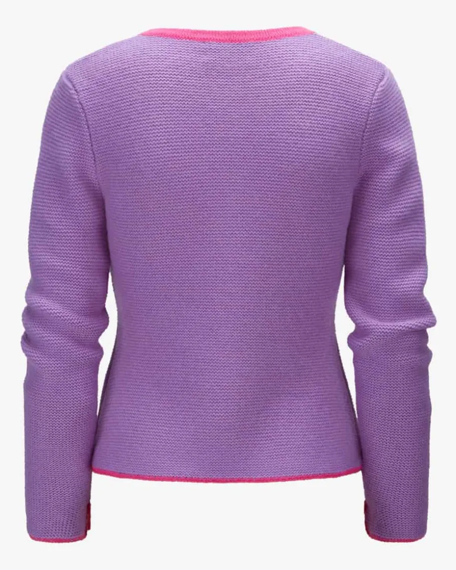 Trachten-Cashmere-Strickjacke für Damen von LODENFREY München 1842 in Violettund Pink. Tradition und Moderne in perfektem Zusammenspiel – Die edleLinksstrick-Jackepräsentiert sich in traditioneller Aufmachung, während die edle QualitätTrachten-Looks harmonisch abrundet.