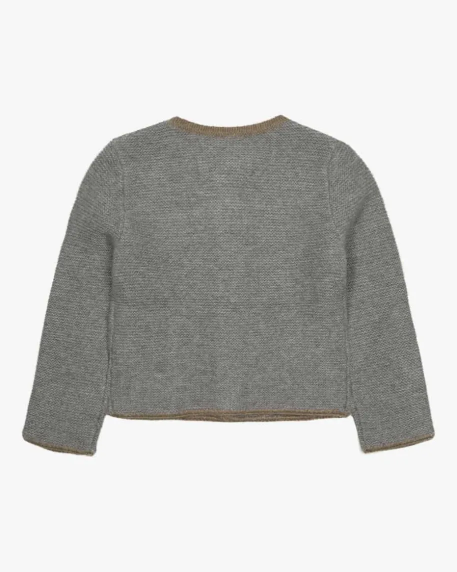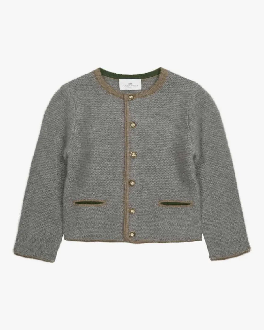 Trachten-Cashmere-Strickjacke für Jungen von LODENFREY in Grau und Braun.Verwöhnen Sie Ihr Kind mit weicher Cashmere-Verarbeitung und besondersangenehmer Haptik, währenddas traditionelle Strick-Design mit farbig abgesetzten Kanten einen stilvollenBegleiter kreiert.