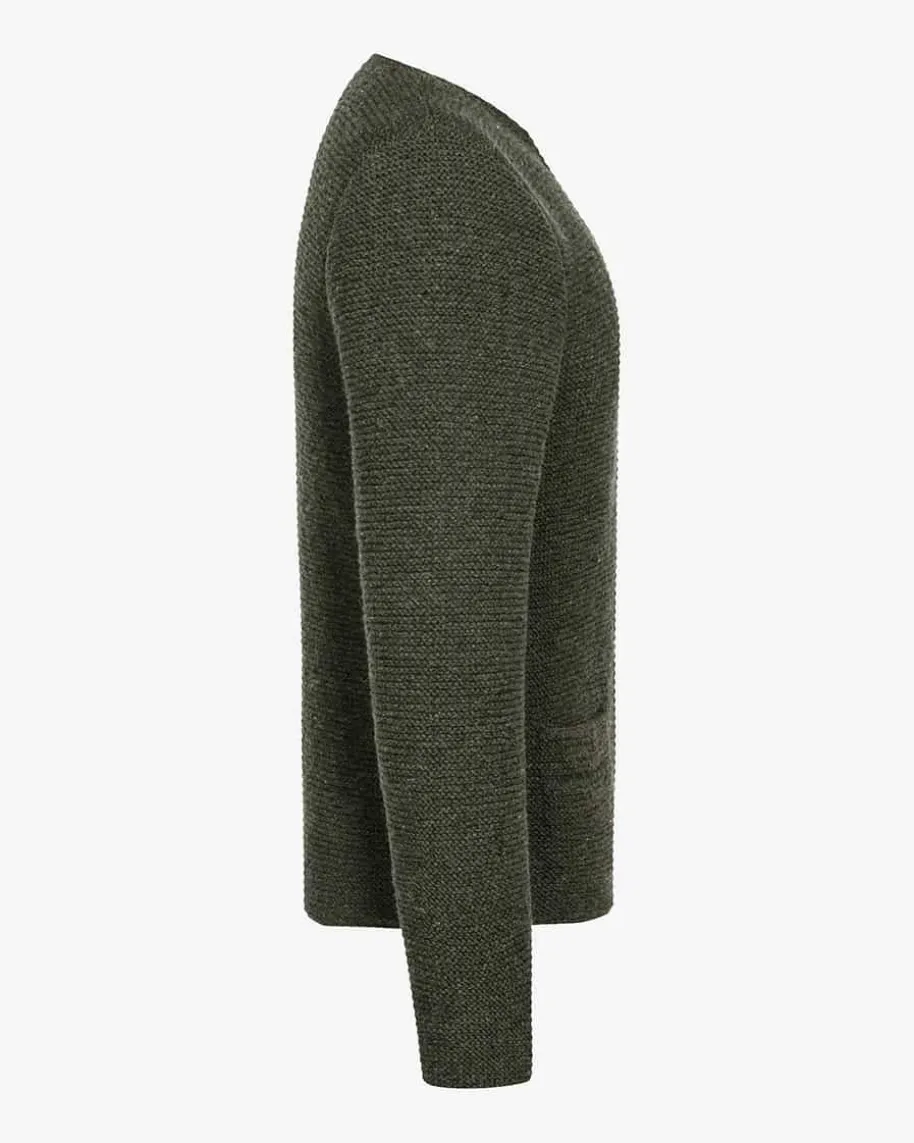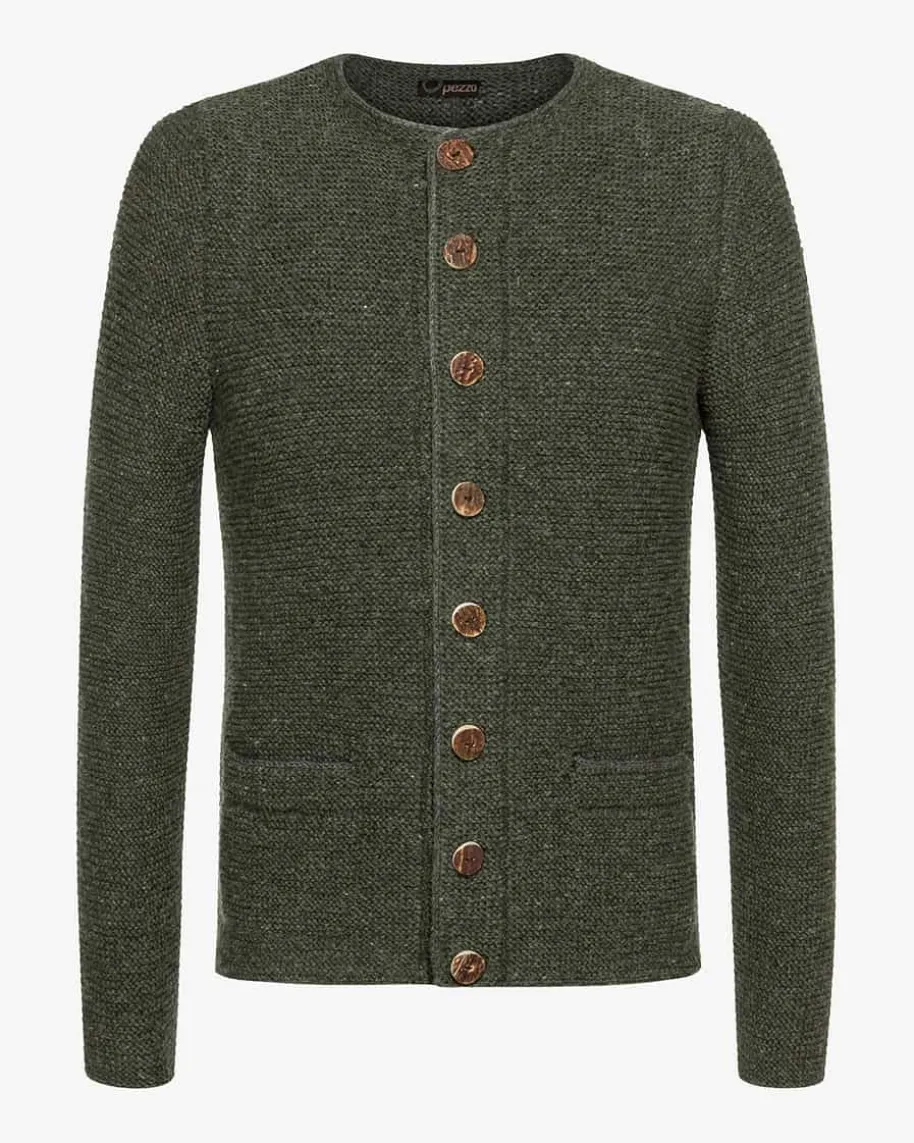 Trachten-Handstrickjacke für Herren von Pezzo in Dunkelgrün.Die Strickjacke aus angenehmer Schurwolle präsentiert sichintraditioneller Aufmachung. Kontrastierende Paspelierungen amRundhals-Ausschnitt, an der durchgehenden Knopfleiste sowie an denzwei Taschen verleiheneine besondere Note, während echte Hornknöpfe das rustikaleGesamtbild gekonntabrunden.