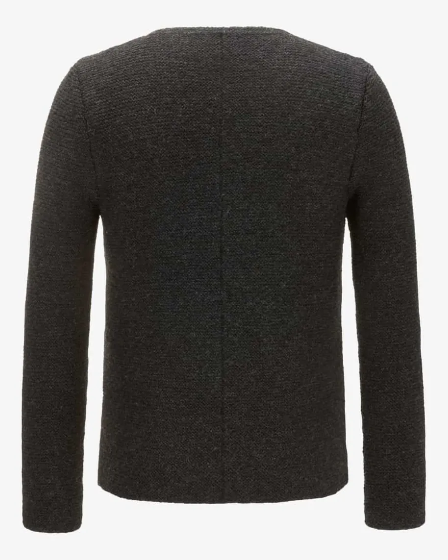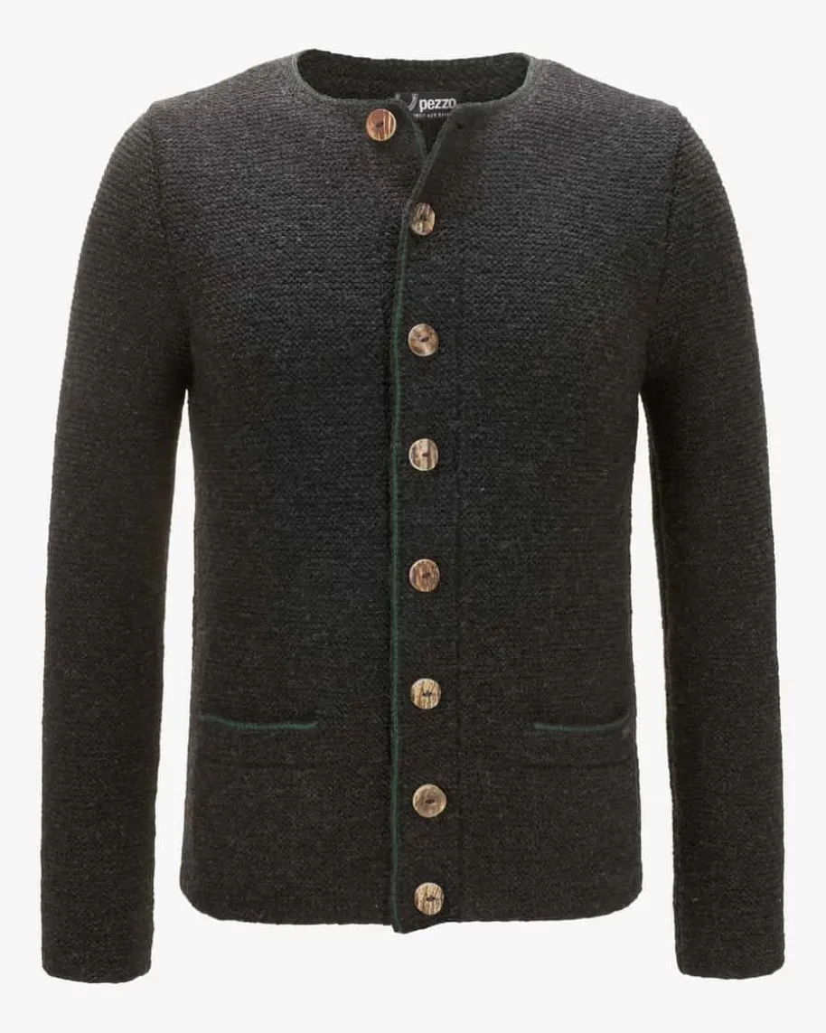 Trachten-Handstrickjacke für Herren von Pezzo in Anthrazit.Die Strickjacke aus angenehmer Schurwolle präsentiert sichintraditioneller Aufmachung. Kontrastierende Paspelierungen amRundhals-Ausschnitt, an der durchgehenden Knopfleiste sowie an denzwei Taschen verleiheneine besondere Note, während echte Hornknöpfe das rustikaleGesamtbild gekonntabrunden.
