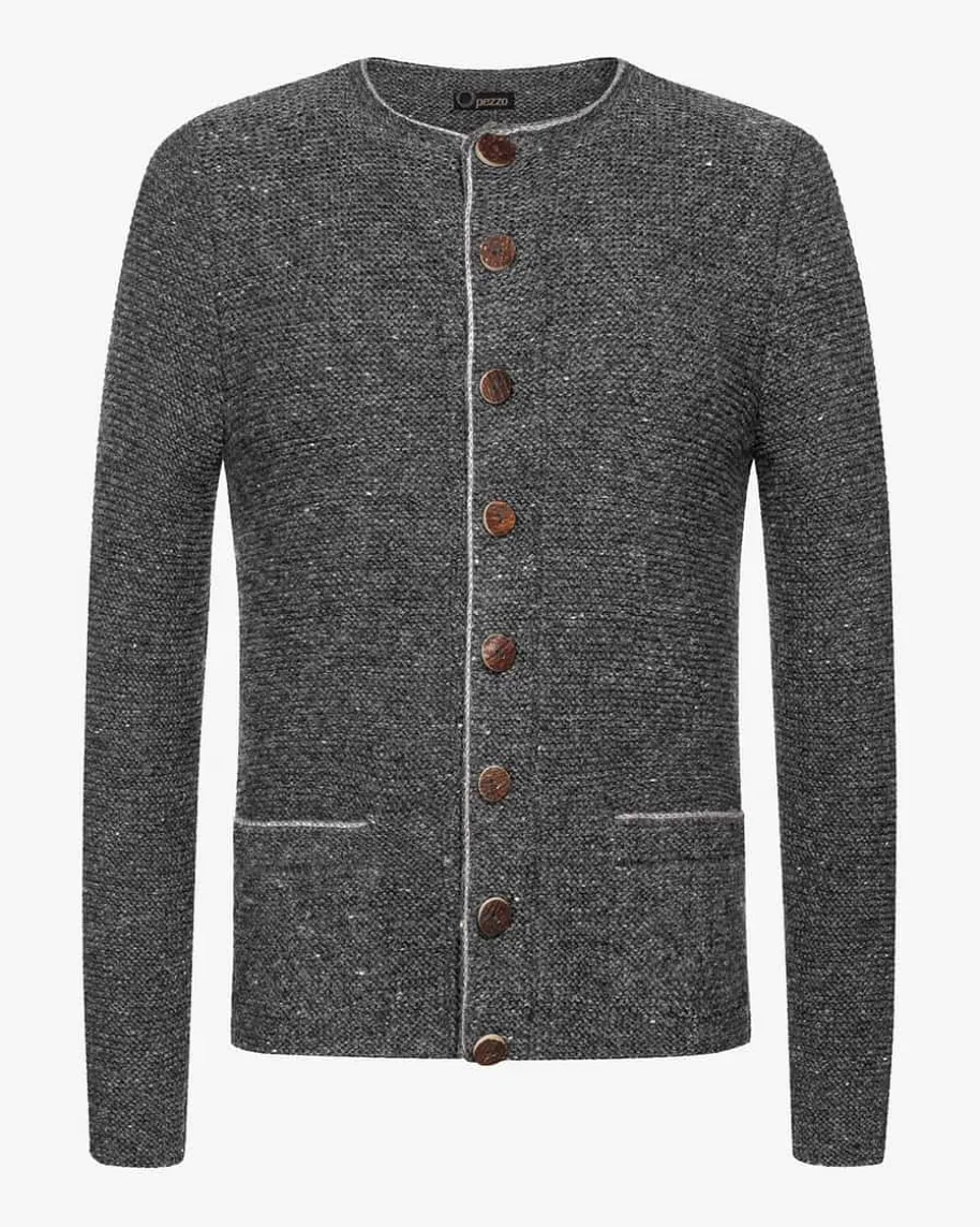 Trachten-Handstrickjacke für Herren von Pezzo in Dunkelgrau.Die Strickjacke aus angenehmer Schurwolle präsentiert sichin traditionellerAufmachung. Kontrastierende Paspelierungen am Rundhals-Ausschnitt, an derdurchgehenden Knopfleiste sowie an den zwei Taschenverleihen eine besondereNote, während echte Hornknöpfe das rustikale Gesamtbildgekonnt abrunden.