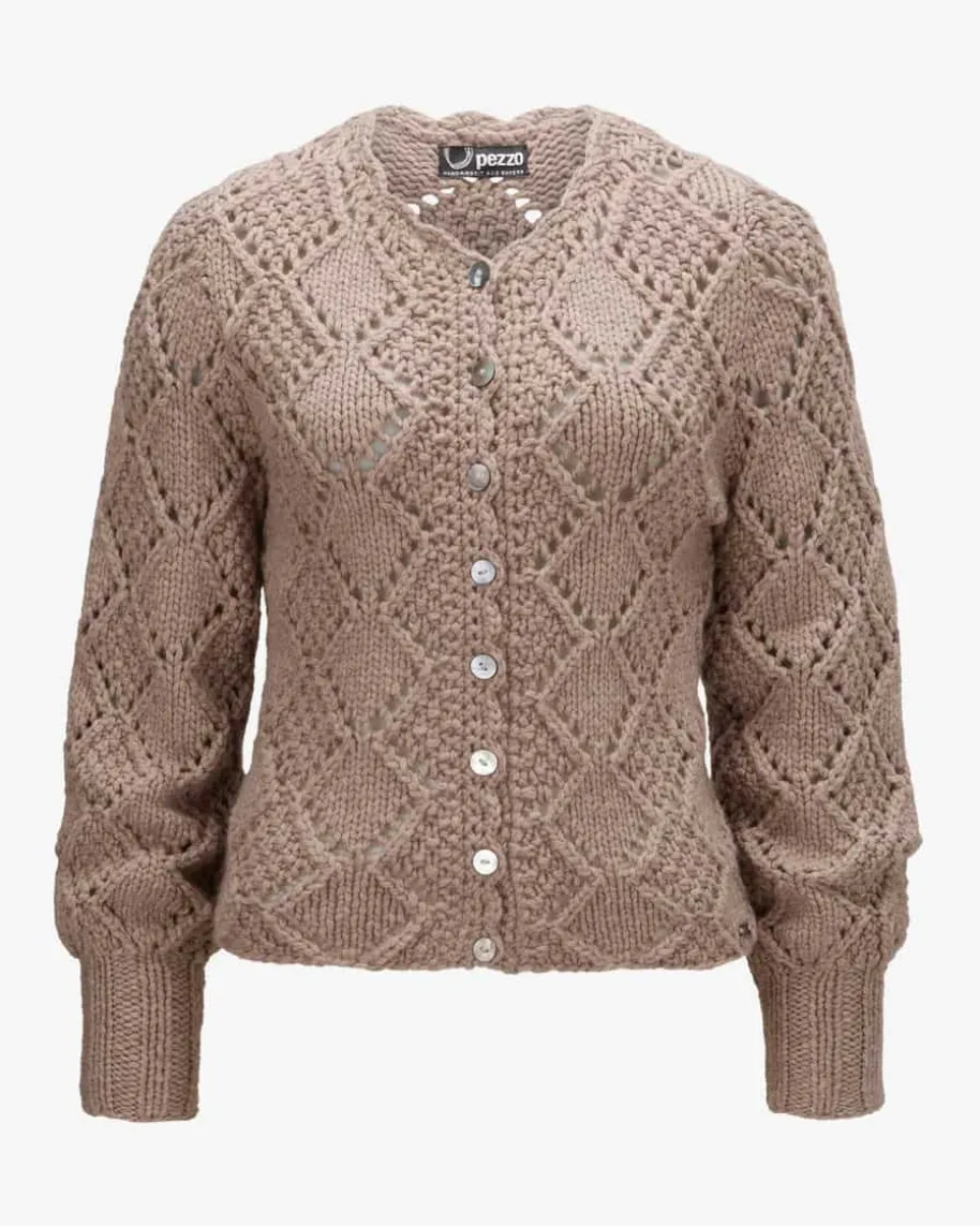 Trachten-Handstrickjacke für Damen von Pezzo in Altrosa. Mitdiesem Modell ausangenehmem Merinowoll-Mix wird ein zeitloser Alltags-Liebling geschaffen, dermit weichem Griff begeistert. Das grobe Strick-Dessin mitLoch-Muster sowiechangierende Knöpfe verleihen dem Modell das gewisse Etwas.
