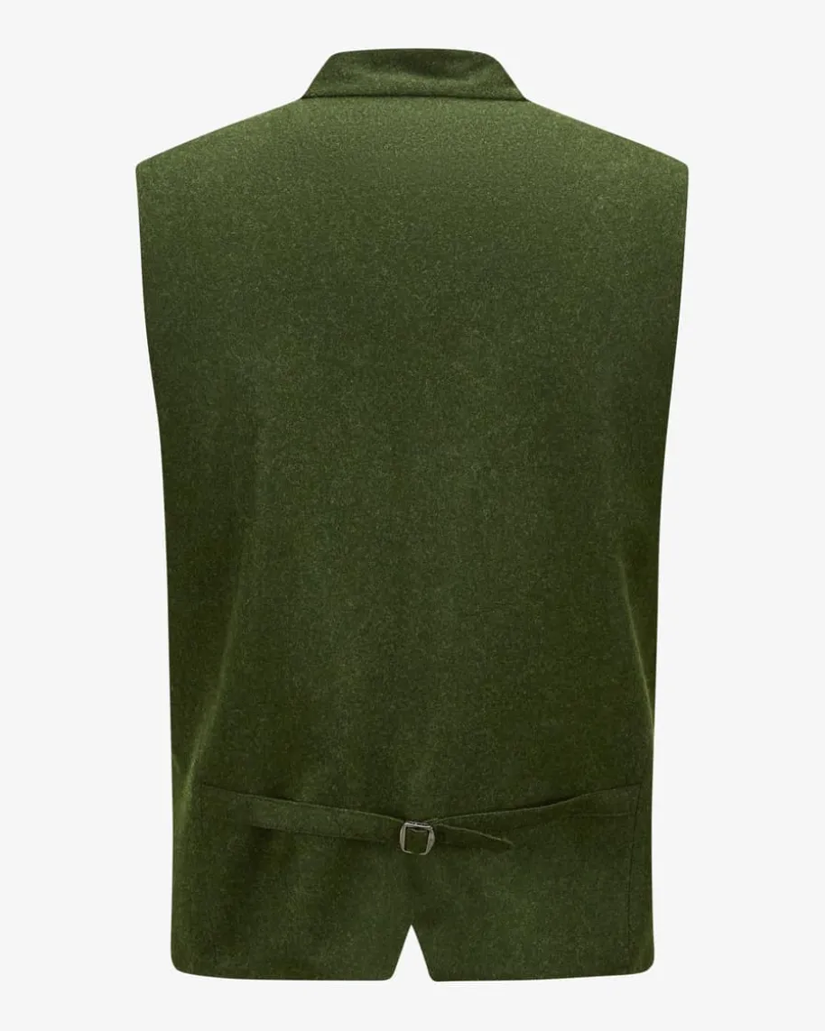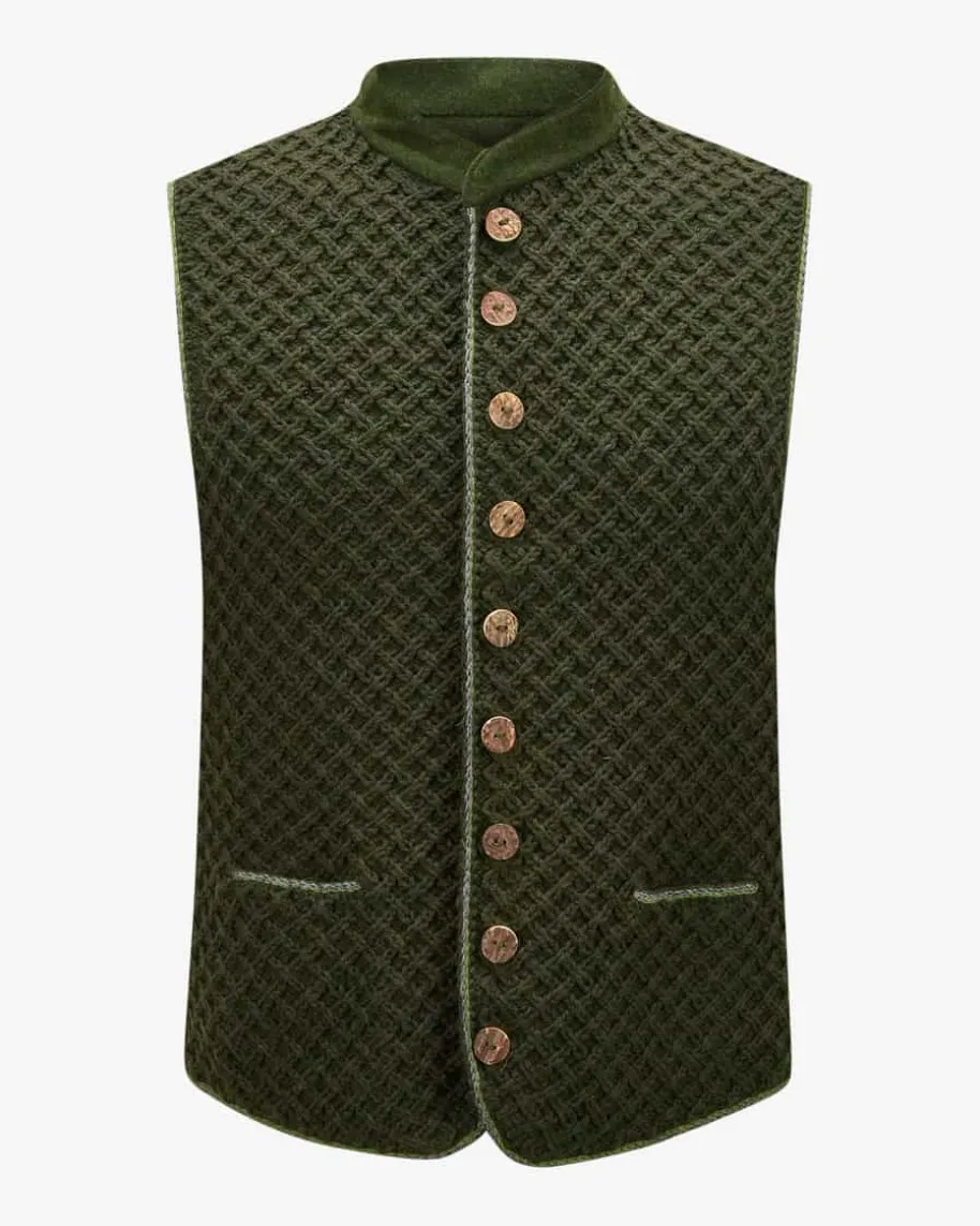 Trachten-Handstrickweste für Herren von Pezzo in Dunkelolivund Oliv. Das Modell zeichnet sich durch die stilvolle Frontmit schönemStrickmuster aus, während die Rückseite aus hochwertigemLoden mit cleanemDesign besticht. Klassische Details sowie die Hornknopf-Leiste vollenden dasGesamtbild mit traditioneller Note.