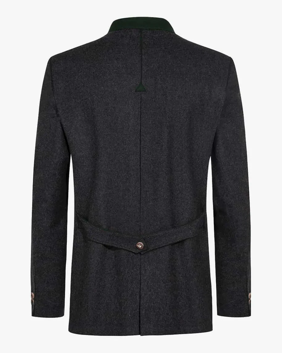 Trachten-Janker für Herren von Sandberg in Anthrazit. Zeitlose Elemente und traditionelles Design verbinden sich in diesem exklusiv für LODENFREY entworfenen Janker. Der gerade Schnitt mit Kellerfalte und Zierriegel auf der Rückseite bietet zusammen mit hochwertiger Schurwolle einen hohen Tragekomfort, während eine leichte Schulterwattierung für eine perfekte Passform sorgt. Moosgrüne Paspelierungen an Stehkragen, Taschen, Manschetten und Knopfleiste verleihen eine elegante Note. Hornknöpfe runden den Trachten-Look gekonnt ab.