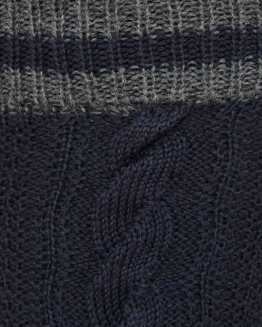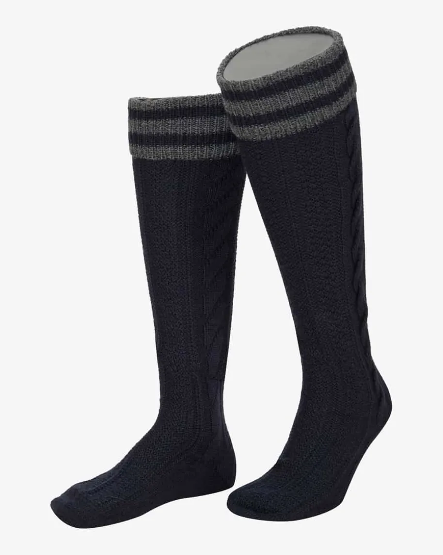 Trachten-Kniestrümpfe für Herren von Lusana in Navy und Grau. PerfekteBegleiter zur Lederhose – Die knielangen Strümpfe aus hochwertigem Woll-Mixbegeistern durch handgekettelte Spitze sowie ein traditionelles Zopfmuster.