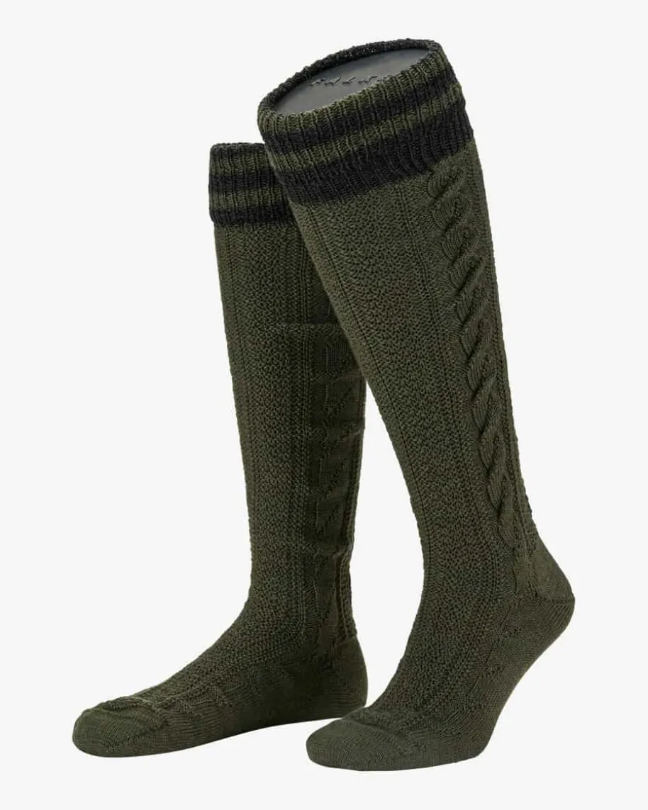 Trachten-Kniestrümpfe für Herren von Lusana in Oliv und Dunkelgrün.Perfekte Begleiter zur Lederhose – Die knielangen Strümpfe aus hochwertigemMerino-Woll-Mix begeistern durch handgekettelte Spitze sowie das traditionelleZopfmuster.