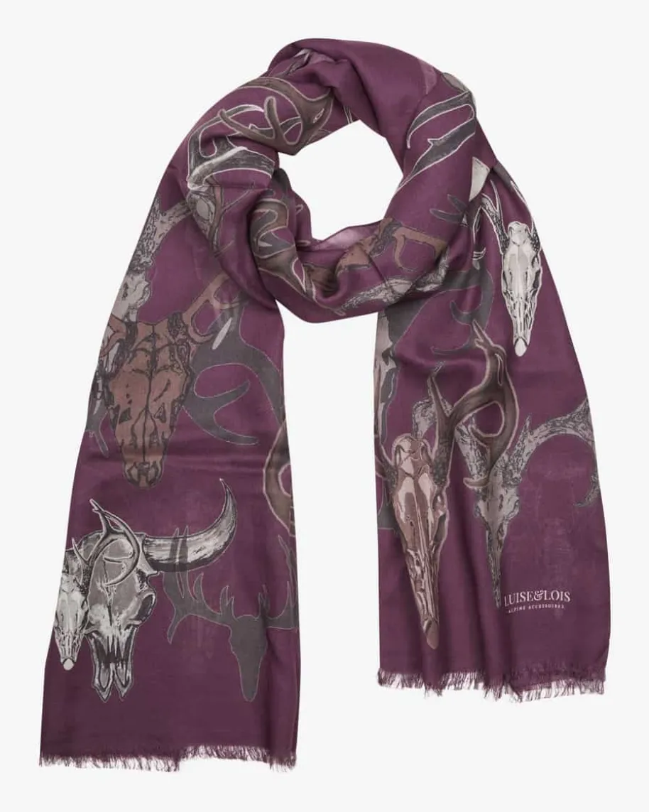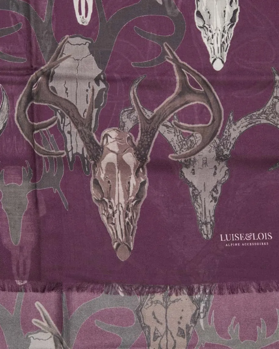 Trachten-Schal für Herren von Luise Steiner in Beere, Braun und Stein. Währenddie Material-Verarbeitung weichen Griff verspricht, wird durch das rustikaleHirsch-Dessin ein maskulines Accessoire für modische Trachten-Looks geschaffen.
