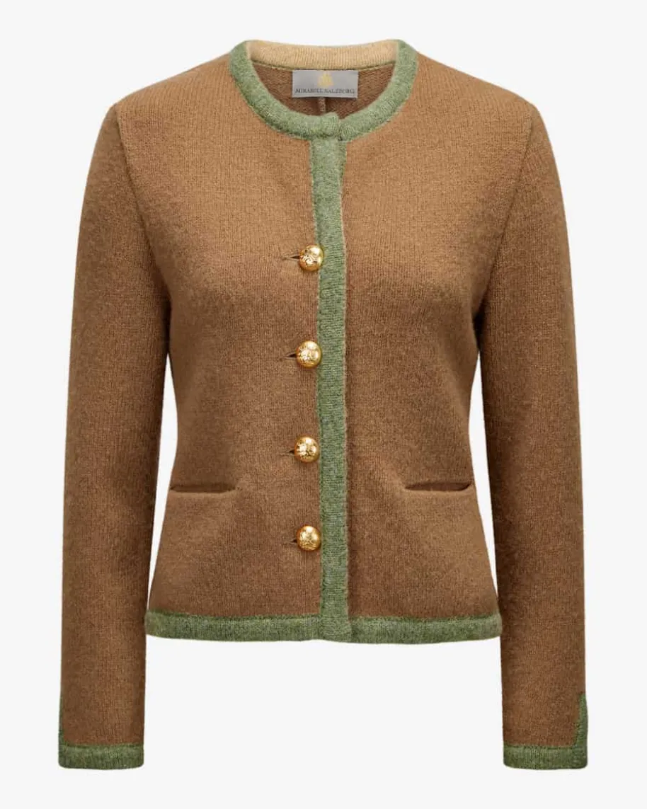 Trachten-Strickjacke für Damen von Mirabell in Camel und Grün. Diehochwertige Schurwoll-Qualität verleiht dem klassischen Modell eineunverwechselbare Haptik, während goldfarbene Wappenknöpfe sowie kontrastierendeElemente einen traditionellen Look mit moderner Note schaffen.