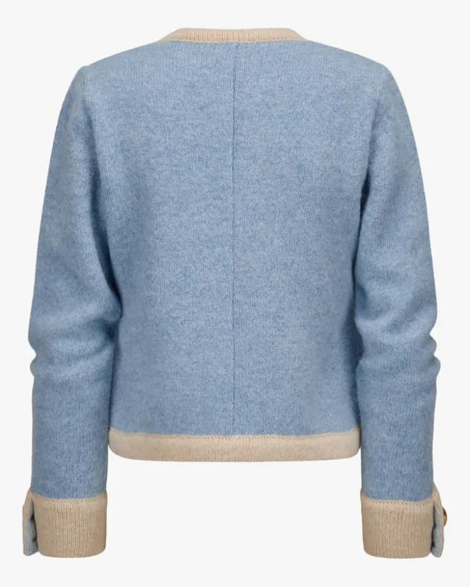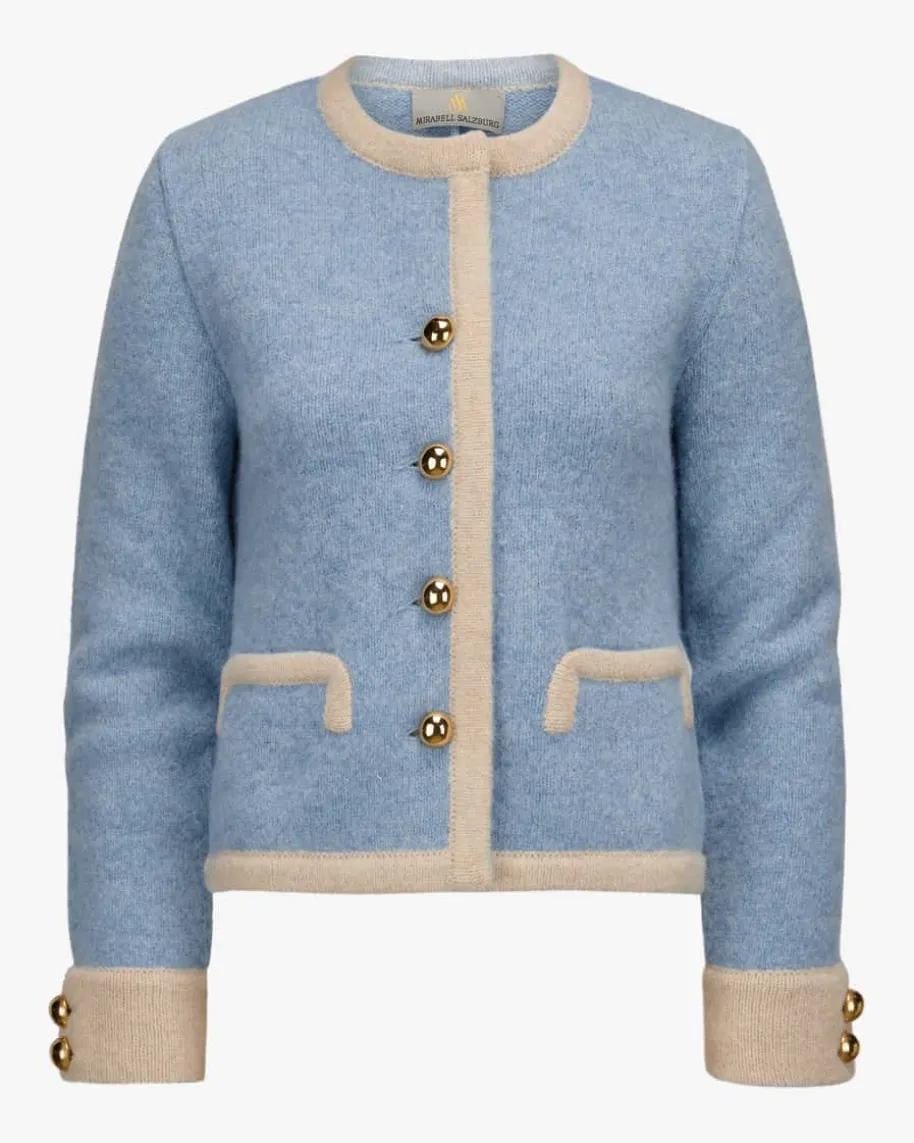 Trachten-Strickjacke für Damen von Mirabell Salzburg in Blau und Beige. Diehochwertige Schurwoll-Qualität verleiht dem klassischen Modell eineunverwechselbare Haptik, während goldfarbenen Kugelknöpfe einen traditionellenLook schaffen und kontrastierende Elemente den Look gekonnt vollenden.