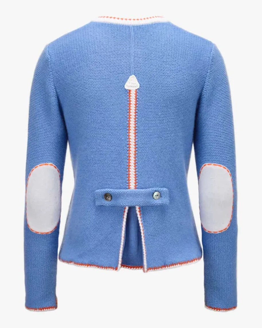 Trachten-Strickjacke für Damen von Pierre Claire in Hellblau, Creme und Orange.Der Mix aus Merinowolle und Cashmere verleiht dem Linksstrick-Modell eineunverwechselbare Haptik, während klassische Details einen traditionellen Lookschaffen und kontrastierende Elemente den Look gekonnt vollenden.