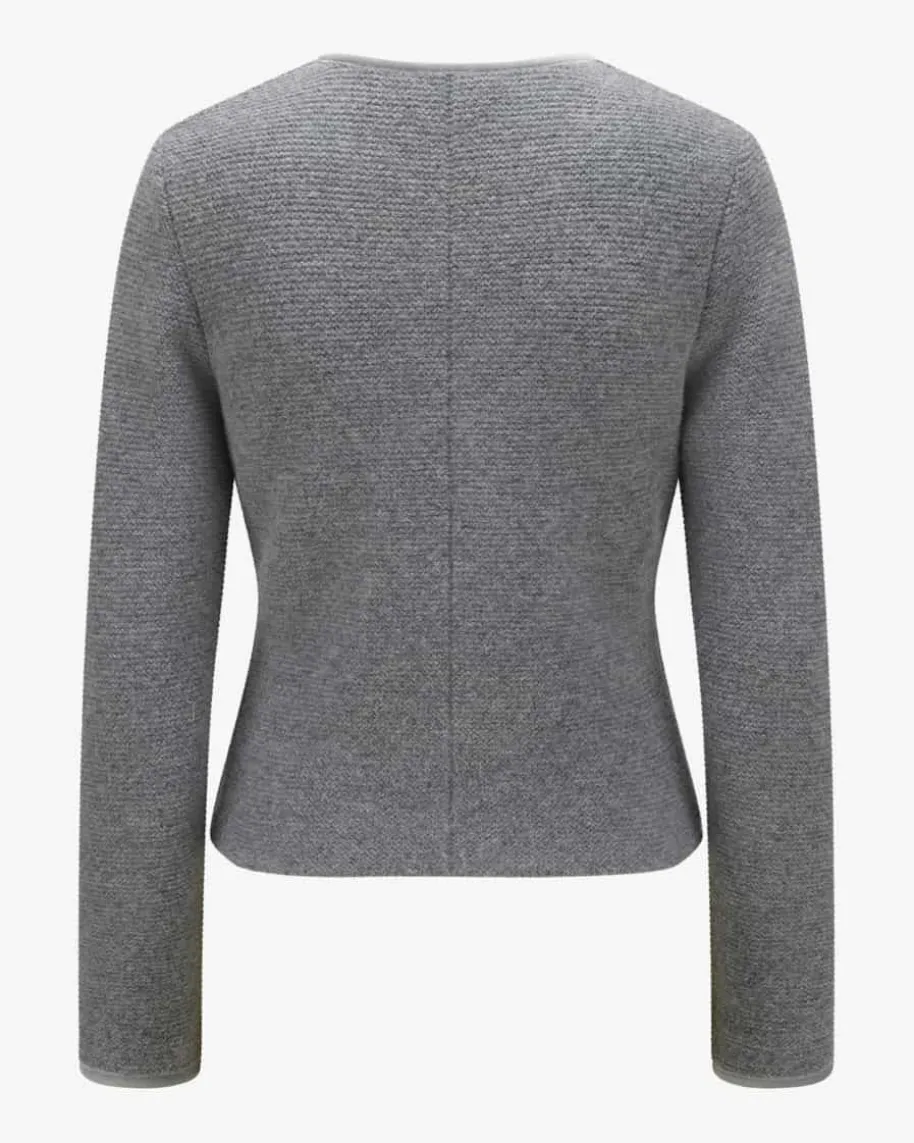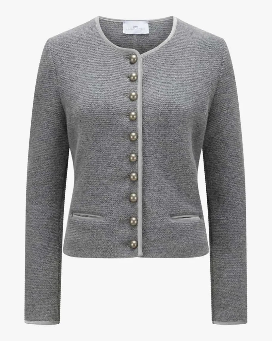 Trachten-Strickjacke für Damen von LODENFREY in Hellgrau. Traditionelles Designund weiche Schurwoll-Qualität zeichnen das gerade geschnittene Modell aus.Ärmelenden, Pattentaschen, Rundhals-Ausschnitt und der Verschluss mitdekorativen Knöpfen sind mit stilvollen Samt-Paspeln versehen.