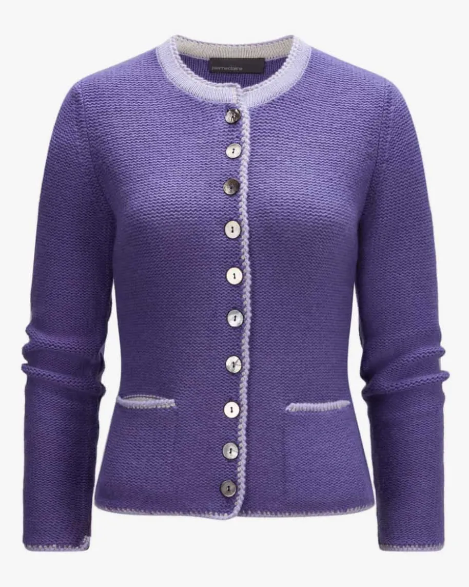 Trachten-Strickjacke für Damen von Pierre Claire in Violett und Flieder. DasModell aus hochwertiger Merinowoll-Cashmere-Qualität punktet mit besondersweichem Griff, während das feine Strick-Muster, modische Kontrastpaspeln sowieKnöpfe in Perlmutt-Optik den traditionellen Trachten-Look harmonisch abrunden.